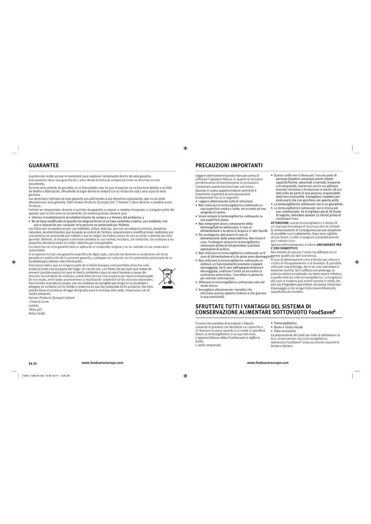 - La termosigillatrice sottovuoto non è intesa per uso commerciale. Se si sigillano più di 30 buste di seguito, attendere almeno 25 minuti prima di continuare l'uso. ATTENZIONE: questa termosigillatrice è dotata di un'avanzata tecnologia di sicurezza che ne richiede la reimpostazione di conseguenza ad una situazione di possibile surriscaldamento. Dopo aver sigillato alcune buste, l'unità si spegnerà automaticamente per 1 minuto circa. Questo elettrodomestico è inteso UNICAMENTE PER L'USO DOMESTICO. Non tentare di riparare l'unità, ma affidarla ad un agente qualificato dell'assistenza. Il cavo di alimentazione corto è fornito per ridurre il rischio di intrappolamento o di inciampo. È possibile utilizzare una prolunga, ma in tal caso esercitare la massima cautela. Se si utilizza una prolunga, la potenza elettrica nominale non deve essere inferiore a quella indicata sulla termosigillatrice. La lunghezza del cavo in esubero può essere avvolta in modo che non sia d'ingombro per evitare che possa intralciare il passaggio o che venga tirata inavvertitamente, soprattutto dai bambini. GUARANTEE Guarde este recibo ya que lo necesitará para cualquier reclamación dentro de esta garantía. Este producto tiene una garantía de 2 años desde la fecha de compra tal como se describe en este documento. Durante este período de garantía, en el improbable caso de que el aparato ya no funcione debido a un fallo de diseño o fabricación, devuélvalo al lugar donde lo compró con su recibo de caja y una copia de esta garantía. Los derechos y ventajas de esta garantía son adicionales a sus derechos estatutarios, que no se verán afectados por esta garantía. Sólo Holmes Products (Europe) Ltd. ("Holmes") tiene derecho a cambiar estos términos. Holmes se compromete, durante el período de garantía, a reparar o cambiar el aparato, o cualquier parte del aparato que no funcione correctamente, de manera gratuita siempre que: