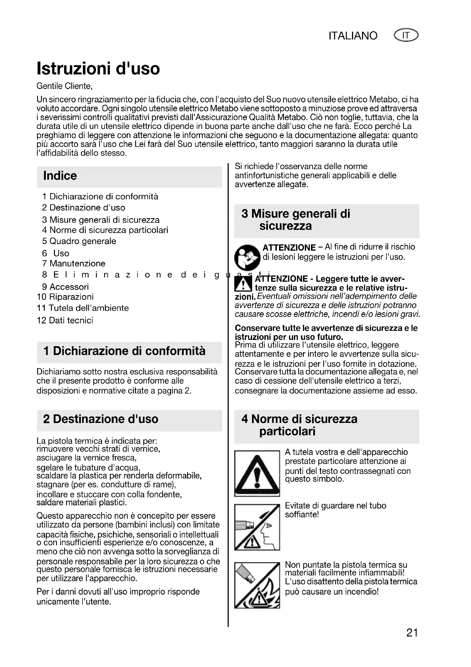 1 Dichiarazione di conformità 2 Destinazione d'uso 3 Misure generali di sicurezza 4 Norme di sicurezza particolari 5 Quadro generale 6Uso 7 Manutenzione 8Eliminazione dei guasti 9 Accessori 10 Riparazioni 11 Tutela dell'ambiente 12 Dati tecnici Dichiariamo sotto nostra esclusiva responsabilità che il presente prodotto è conforme alle disposizioni e normative citate a pagina 2. La pistola termica è indicata per: rimuovere vecchi strati di vernice, asciugare la vernice fresca, sgelare le tubature d'acqua, scaldare la plastica per renderla deformabile, stagnare (per es. condutture di rame), incollare e stuccare con colla fondente, saldare materiali plastici. Questo apparecchio non è concepito per essere utilizzato da persone (bambini inclusi) con limitate capacità fisiche, psichiche, sensoriali o intellettuali o con insufficienti esperienze e/o conoscenze, a meno che ciò non avvenga sotto la sorveglianza di personale responsabile per la loro sicurezza o che questo personale fornisca le istruzioni necessarie per utilizzare l'apparecchio. Per i danni dovuti all'uso improprio risponde unicamente l'utente. Si richiede l'osservanza delle norme antinfortunistiche generali applicabili e delle avvertenze allegate. ATTENZIONE – Al fine di ridurre il rischio di lesioni leggere le istruzioni per l'uso. ATTENZIONE - Leggere tutte le avver- tenze sulla sicurezza e le relative istru- zioni. Eventuali omissioni nell’adempimento delle avvertenze di sicurezza e delle istruzioni potranno causare scosse elettriche, incendi e/o lesioni gravi. Conservare tutte le avvertenze di sicurezza e le istruzioni per un uso futuro. Prima di utilizzare l'utensile elettrico, leggere attentamente e per intero le avvertenze sulla sicu- rezza e le istruzioni per l'uso fornite in dotazione. Conservare tutta la documentazione allegata e, nel caso di cessione dell'utensile elettrico a terzi, consegnare la documentazione assieme ad esso. A tutela vostra e dell'apparecchio prestate particolare attenzione ai punti del testo contrassegnati con questo simbolo. Evitate di guardare nel tubo soffiante! Non puntate la pistola termica su materiali facilmente infiammabili! L'uso disattento della pistola termica può causare un incendio! Istruzioni d'uso Gentile Cliente, Un sincero ringraziamento per la fiducia che, con l'acquisto del Suo nuovo utensile elettrico Metabo, ci ha voluto accordare. Ogni singolo utensile elettrico Metabo viene sottoposto a minuziose prove ed attraversa i severissimi controlli qualitativi previsti dall'Assicurazione Qualità Metabo. Ciò non toglie, tuttavia, che la durata utile di un utensile elettrico dipende in buona parte anche dall'uso che ne farà. Ecco perché La preghiamo di leggere con attenzione le informazioni che seguono e la documentazione allegata: quanto più accorto sarà l'uso che Lei farà del Suo utensile elettrico, tanto maggiori saranno la durata utile l'affidabilità dello stesso. Indice 1 Dichiarazione di conformità 2 Destinazione d'uso 3 Misure generali di sicurezza 4 Norme di sicurezza particolari 17024612_0409 HE 2300 HE 2000 H 1600.book Seite 21 Dienstag, 16. Juni 2009 11:40 1122 ITALIANO