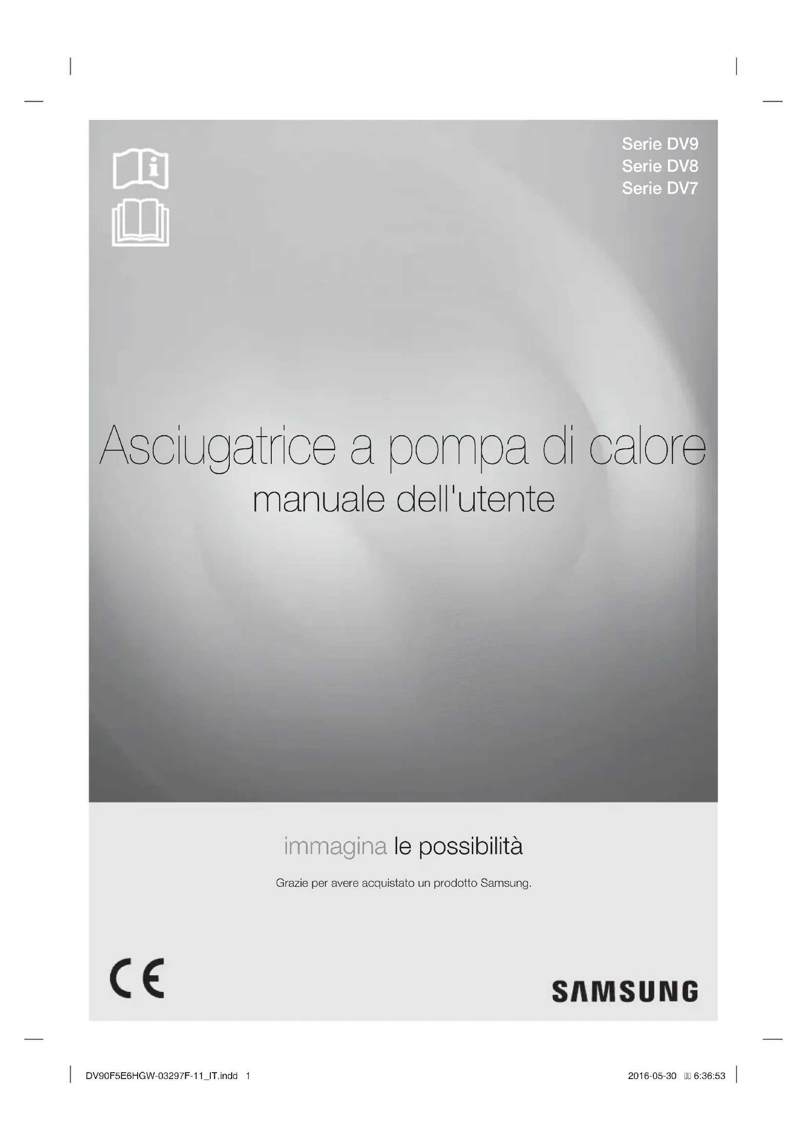32 Tabella tessuti 33 Protezione dell'ambiente 33 Specifi che 34 Tabella programmi 34 Dati sul consumo 35 Scheda tecnica delle asciugatrici per uso domestico DV90F5E6HGW-03297F-11_IT.indd Sec9:2DV90F5E6HGW-03297F-11_IT.indd Sec9:2 2016-05-30 6:37:012016-05-30 6:37:01Italiano - 3 informazioni di sicurezza Congratulazioni per l’acquisto della tua nuova asciugatrice Samsung. Questo manuale contiene importanti informazioni riguardanti l’installazione, l’uso e la manutenzione del tuo nuovo apparecchio. Ti consigliamo di leggere le informazioni qui fornite per conoscere tutti i vantaggi o erti da questa macchina. AVVERTENZA - Rischio di incendio