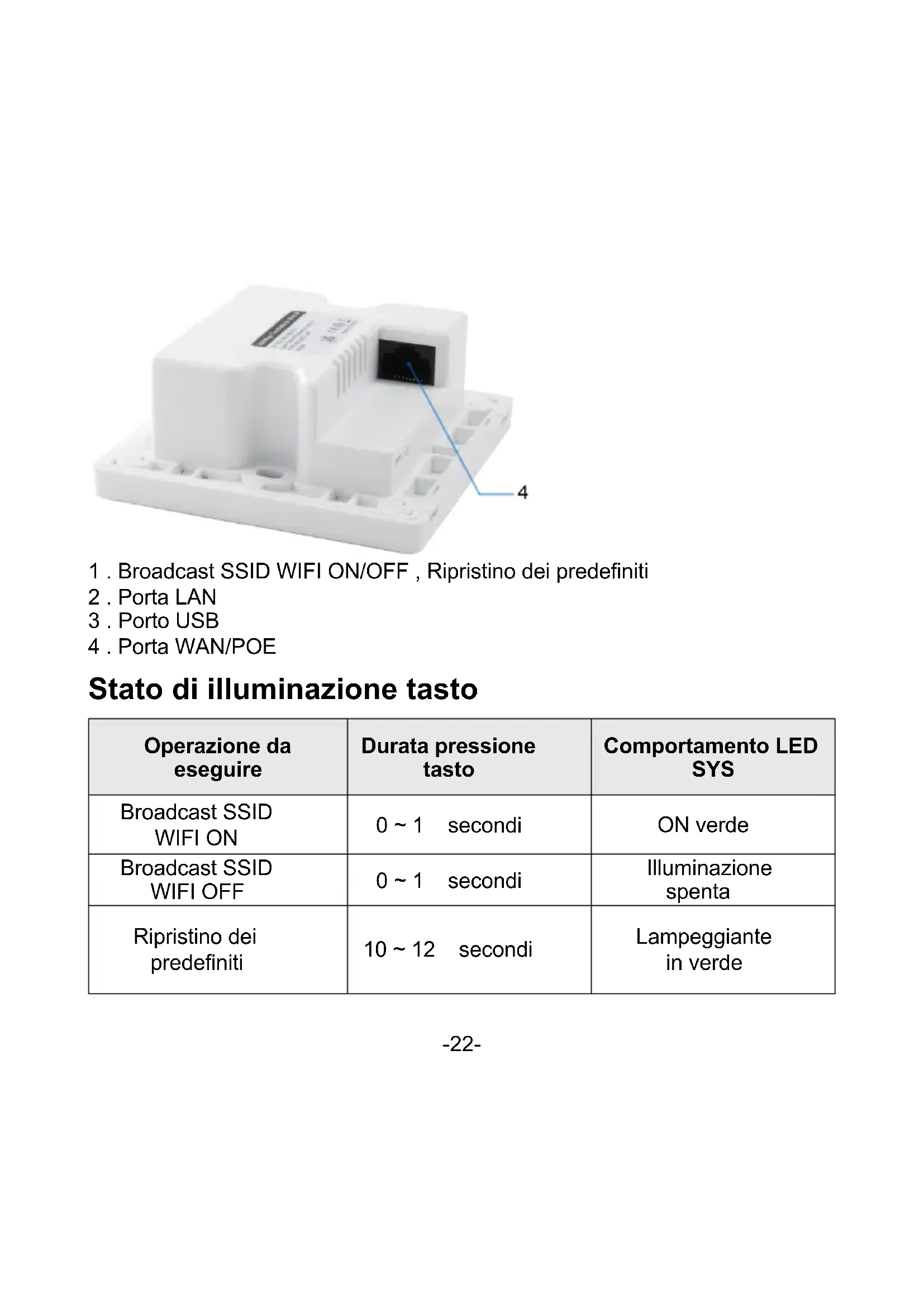 | Broadcast SSID WIFI OFF | 0 ~ 1 secondi | Illuminazione spenta |