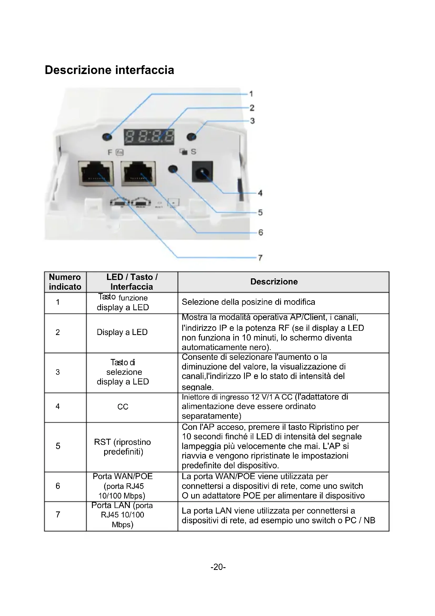 | 2 | Display a LED | Mostra la modalità operativa AP/Client, i canali, l'indirizzo IP e la potenza RF (se il display a LED non funziona in 10 minuti, lo schermo diventa automaticamente nero). |