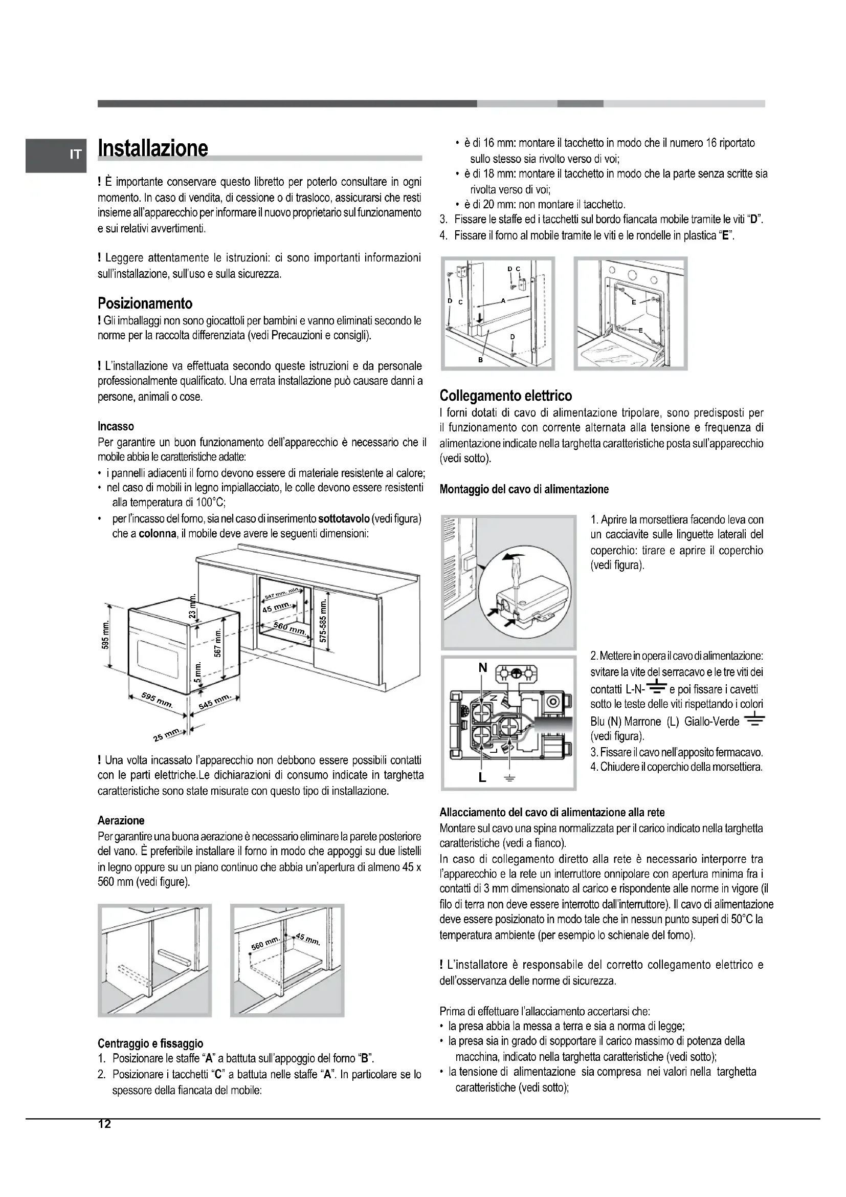 Installazione ! È importante conservare questo libretto per poterlo consultare in ogni momento. In caso di vendita, di cessione o di trasloco, assicurarsi che resti insieme all’apparecchio per informare il nuovo proprietario sul funzionamento e sui relativi avvertimenti.! Leggere attentamente le istruzioni: ci sono importanti informazioni sull’installazione, sull’uso e sulla sicurezza. Posizionamento ! Gli imballaggi non sono giocattoli per bambini e vanno eliminati secondo le norme per la raccolta differenziata (vedi Precauzioni e consigli).! L’installazione va effettuata secondo queste istruzioni e da personale professionalmente qualicato. Una errata installazione può causare danni a persone, animali o cose.IncassoPer garantire un buon funzionamento dell’apparecchio è necessario che il mobile abbia le caratteristiche adatte:• i pannelli adiacenti il forno devono essere di materiale resistente al calore;• nel caso di mobili in legno impiallacciato, le colle devono essere resistenti alla temperatura di 100°C;
