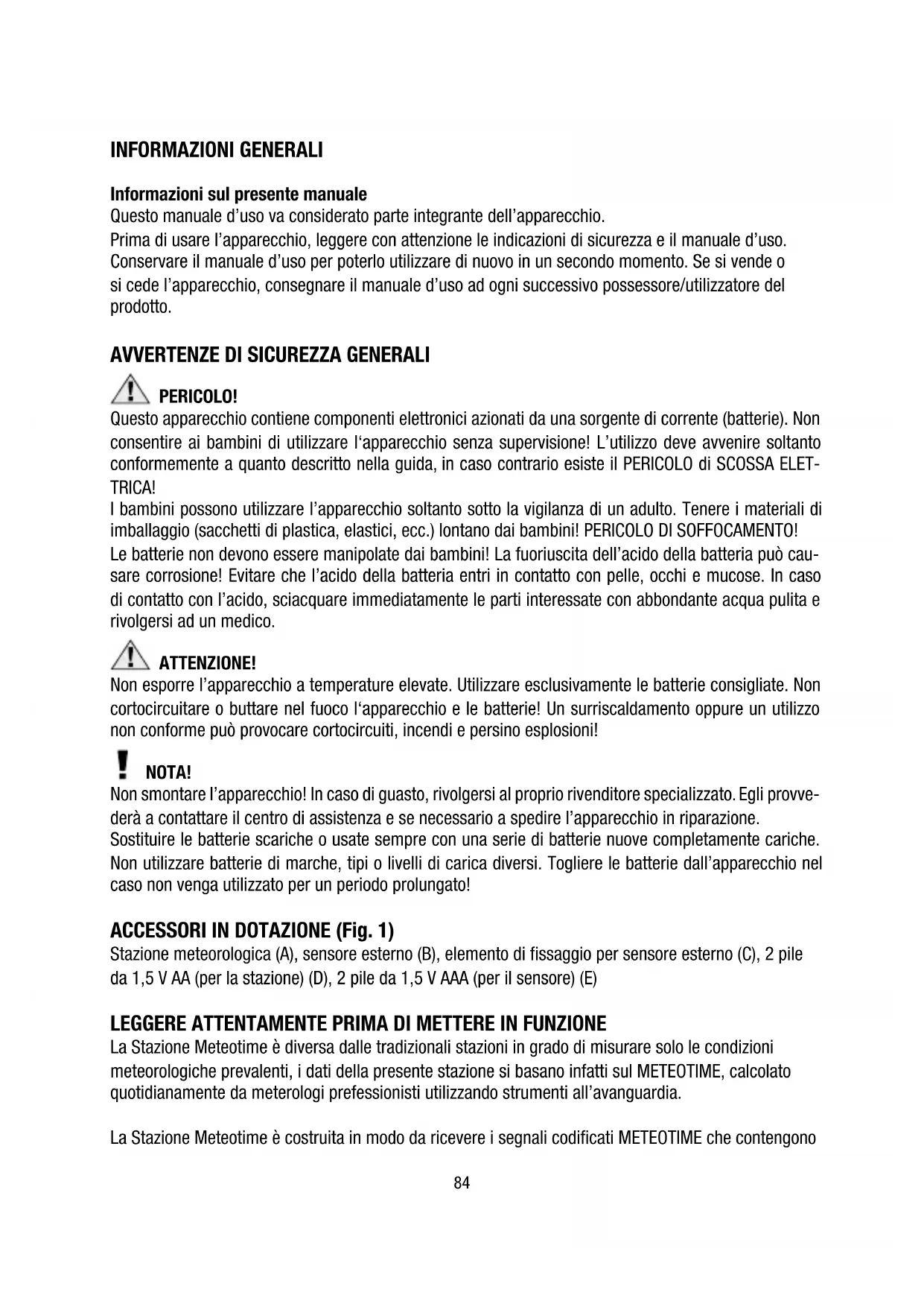 PERICOLO! Questo apparecchio contiene componenti elettronici azionati da una sorgente di corrente (batterie). Non consentire ai bambini di utilizzare l‘apparecchio senza supervisione! L’utilizzo deve avvenire soltanto conformemente a quanto descritto nella guida, in caso contrario esiste il PERICOLO di SCOSSA ELET- TRICA! I bambini possono utilizzare l’apparecchio soltanto sotto la vigilanza di un adulto. Tenere i materiali di imballaggio (sacchetti di plastica, elastici, ecc.) lontano dai bambini! PERICOLO DI SOFFOCAMENTO! Le batterie non devono essere manipolate dai bambini! La fuoriuscita dell’acido della batteria può cau- sare corrosione! Evitare che l’acido della batteria entri in contatto con pelle, occhi e mucose. In caso di contatto con l’acido, sciacquare immediatamente le parti interessate con abbondante acqua pulita e rivolgersi ad un medico. ATTENZIONE! Non esporre l’apparecchio a temperature elevate. Utilizzare esclusivamente le batterie consigliate. Non cortocircuitare o buttare nel fuoco l‘apparecchio e le batterie! Un surriscaldamento oppure un utilizzo non conforme può provocare cortocircuiti, incendi e persino esplosioni! NOTA! Non smontare l’apparecchio! In caso di guasto, rivolgersi al proprio rivenditore specializzato. Egli provve- derà a contattare il centro di assistenza e se necessario a spedire l’apparecchio in riparazione. Sostituire le batterie scariche o usate sempre con una serie di batterie nuove completamente cariche. Non utilizzare batterie di marche, tipi o livelli di carica diversi. Togliere le batterie dall’apparecchio nel caso non venga utilizzato per un periodo prolungato! ACCESSORI IN DOTAZIONE (Fig. 1) Stazione meteorologica (A), sensore esterno (B), elemento di fissaggio per sensore esterno (C), 2 pile da 1,5 V AA (per la stazione) (D), 2 pile da 1,5 V AAA (per il sensore) (E) LEGGERE ATTENTAMENTE PRIMA DI METTERE IN FUNZIONE La Stazione Meteotime è diversa dalle tradizionali stazioni in grado di misurare solo le condizioni meteorologiche prevalenti, i dati della presente stazione si basano infatti sul METEOTIME, calcolato quotidianamente da meterologi prefessionisti utilizzando strumenti all’avanguardia. La Stazione Meteotime è costruita in modo da ricevere i segnali codificati METEOTIME che contengono85 IT/CH le previsioni meteorologiche. Le previsioni sono trasmesse attraverso DCF stazione per orologi (situati in Germania). Per questa ragione, la Stazione Meteotime è anche un orologio radiocontrollato con tutti i vantaggi che un orologio radiocontrollato può avere, come mostrare sempre l’ora esatta, e applicare automaticamente il cambiamento da ora solare a ora legale. La stazione può ricevere previsioni meteorologiche per 60 regioni meteorologiche all’interno dell’Euro- pa con 4 giorni d’anticipo e previsioni meteorologiche con 2 giorni d’anticipo per 30 ulteriori regioni. DI COSA SI NECESSITA PER AVERE UN’OTTIMA RICEZIONE? Come per i segnali wireless delle reti per i telefoni cellulari o la Radio/le trasmissioni televisive, è pssibile che la Stazione Meteotime non riceva sempre e ovunque i segnali. Seguire quanto riportato sotto per assicurarsi che l’apparecchio funzioni correttamente: Il luogo dove installare la Stazione Meteotime è molto importante. Per questa ragione le stazioni sono state dotate di un’innovativa funzione di test (il tasto TEST) che permette di testare la qualità della ricezione nell’ambiente dove la stazione viene posta e di porre l’apparecchio dove prevalga una migliore ricettività. Testare la ricettività della Stazione Meteotime come indicato nel manuale. Accendere per esempio tutte le potenziali fonti di interferenza (per esempio un televisore) nella stanza dove si vuole installare l’apparecchio. Quindi installare la Stazione Meteotime dove desiderato, ma ad almeno un metro dalla potenziale fonte di interferenza. Monitorare i simboli GOOD RECEPTION (Ricezione Buona) e BAD RECEPTION (Ricezione Scar- sa) sul display. Quando il simbolo GOOD RECEPTION (Ricezione Buona) viene visualizzato sul display, installare la Stazione Meteotime, la stazione raccoglierà i dati via segnale radiocon- trollato. Dopo qualche minuto compariranno ora e data. Comunque, si impiegherà più tempo per il trasferimento di una grande quantità di dati (previsioni per tutte le regioni e i giorni). Si impiegheranno fino a 24 ore per ricevere completamente tutti i dati dal momento della prima installazione.