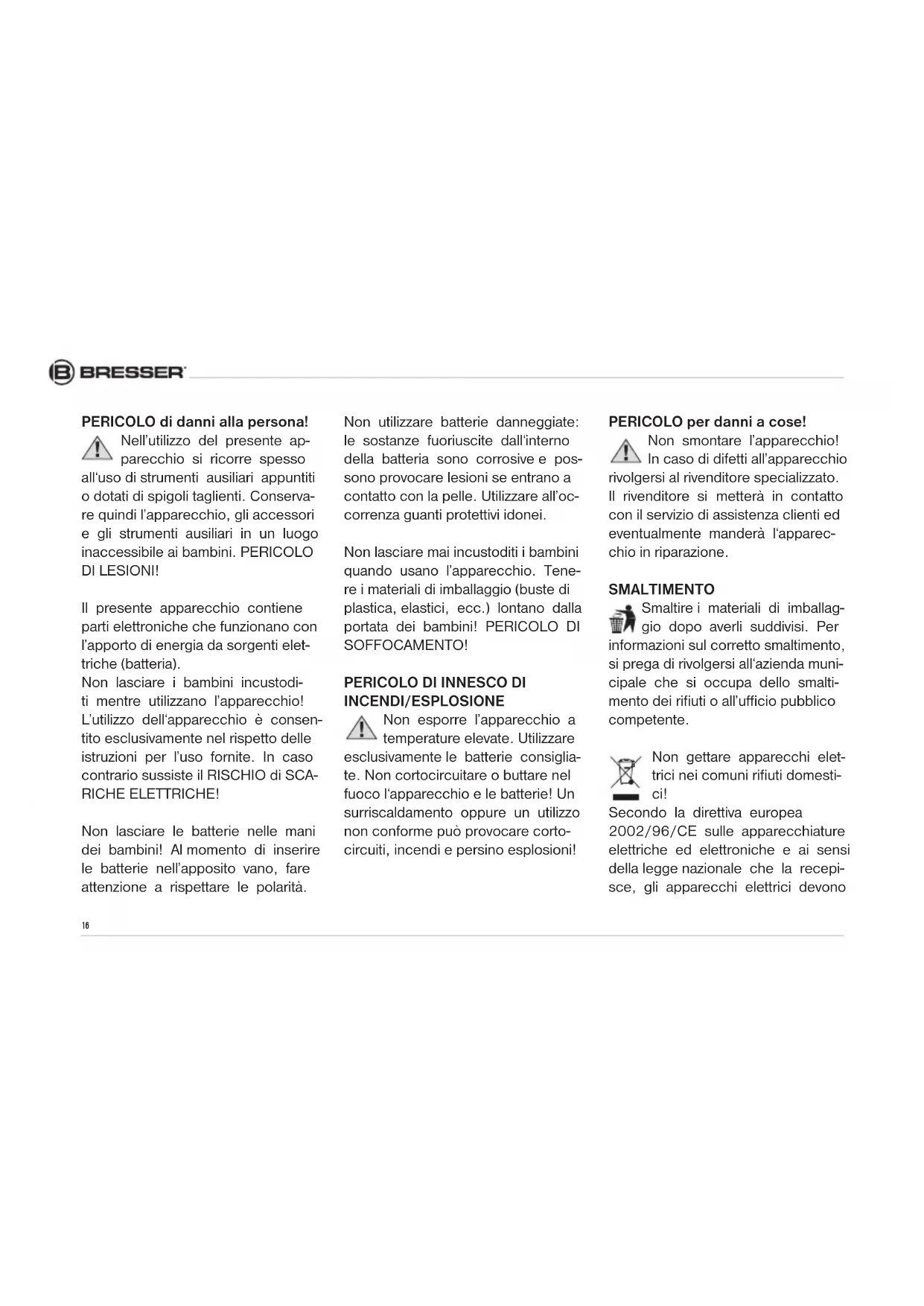 Batteria contiene piombo Dichiarazione di conformità CE Een “conformiteitsverklaring” in overeenstemming met de van toepassing zijnde richtlijnen en overeenkomstige normen is door Bresser GmbH afgegeven. Deze kan elk moment op aanvraag worden in- gezien. essere differenziati e smaltiti sepa- ratamente per poter essere trattati e riciclati nel rispetto dell’ambiente. Le batterie normali e ricarica- bili devono essere corretta- mente smaltiti come sta previsto dalla legge. È possibile tornare batterie inutilizzati presso il punto di vendita o cedere in centri di raccolta organizza- ti dai comuni per la raccolta gratuita- mente. Le batterie normali e ricaricabili sono contrassegnati con il simbolo corri- spondente disposte per lo smaltimen- to e il simbolo chimico della sostanza inquinante. Per Esempio: “CD” sta per il cadmio, il “Hg” sta per mercurio e “Pb” per il piombo. Cd¹ Hg² Pb³ I componenti del tuo microscopio (fig. 1-4): 1 Testata binoculare (con portaoculari) 2 Obiettivo stereoscopico 3 Oculari 4 Illuminazione a LED 5 Tavolino portaoggetti (con piastra portaoggetti bicolore) 6 Clip 7 Ghiera della messa a fuoco 8 Interruttore acceso/spento 9 Vano batterie 10 Viti di fissaggio 11 Coperchio del vano batterie 12 Contatti delle batterie (lamierini piatti e morsetti a molla) 13 Protezione dalla luce diffusa Ubicazione Prima di cominciare, cerca una po- sizione adatta per effettuare le tue osservazioni al microscopio. È im- portante che ci sia luce a sufficienza (finestra, lampada da tavolo).18 Osservazione semplice Posiziona l’oggetto da osservare (per esempio una pietra) al centro del tavolino portaoggetti (5). La piastra portaoggetti è estraibile e presenta un lato nero e un lato bianco. Il lato nero è più indicato per osservare og- getti chiari o trasparenti. Se l‘oggetto è sufficientemente gran- de è meglio fissarlo con le clip (6). Guarda attraverso la testata binocula- re (1) e modifica la distanza degli ocu- lari (3) finché l‘immagine non apparirà nitida e perfettamente circolare. Per regolare la messa a fuoco gira lentamente la ghiera (7). Sostituzione delle pile Spegnere l’illuminazione (4) median- te l’interruttore principale (8). Rimuovi entrambi gli oculari (3) dai portaocu- lari (1) e capovolgi il microscopio. Nella base del microscopio si trova il vano batterie (9). Allentare le 6 viti di fissaggio (10) del coperchio del vano pile (11) situato sul lato inferiore dello strumento, quindi rimuovere il coperchio. Inserisci le batterie in modo tale che l’estremità piatta della batteria, cioè il polo negativo (-), prema contro il mor- setto a molla e che il polo positivo (+) sia a contatto con il lamierino (12). Rimettere il coperchio (11) e fissarlo con le 6 viti (10). Capovolgere il mi- croscopio. Rimetti gli oculari al loro posto. Ora, premendo l’interruttore acceso/spento (8), situato sulla base del microscopio, puoi accendere e spegnere l’illuminazione (4). AVVERTENZE per la pulizia Per pulire l’apparecchio, scollegarlo dalla sorgente di energia elettrica (ri- muovere le batterie)! Pulire l’apparecchio solo esterna- mente con un panno asciutto. Non utilizzare liquido detergente per evitare che i componenti elettronici dell’apparecchio si danneggino. Proteggere l’apparecchio da polvere e umidità! Conservarlo nella custodia in dotazione o nella confezione ori- ginale. Laddove l’apparecchio resti inutilizzato per un periodo di tempo prolungato, rimuovere le batterie. Pulire le lenti (oculare e obiettivo) solo con l‘apposito panno in dotazione op- pure con un altro panno morbido che non lasci peli (per es. in microfibra). Non premere con il panno sulle lenti per evitare che si graffino. Per rimuovere i residui di sporco più ostinati inumidire il panno con un li- quido detergente per occhiali e puli- re le lenti esercitando solo una lieve pressione.19