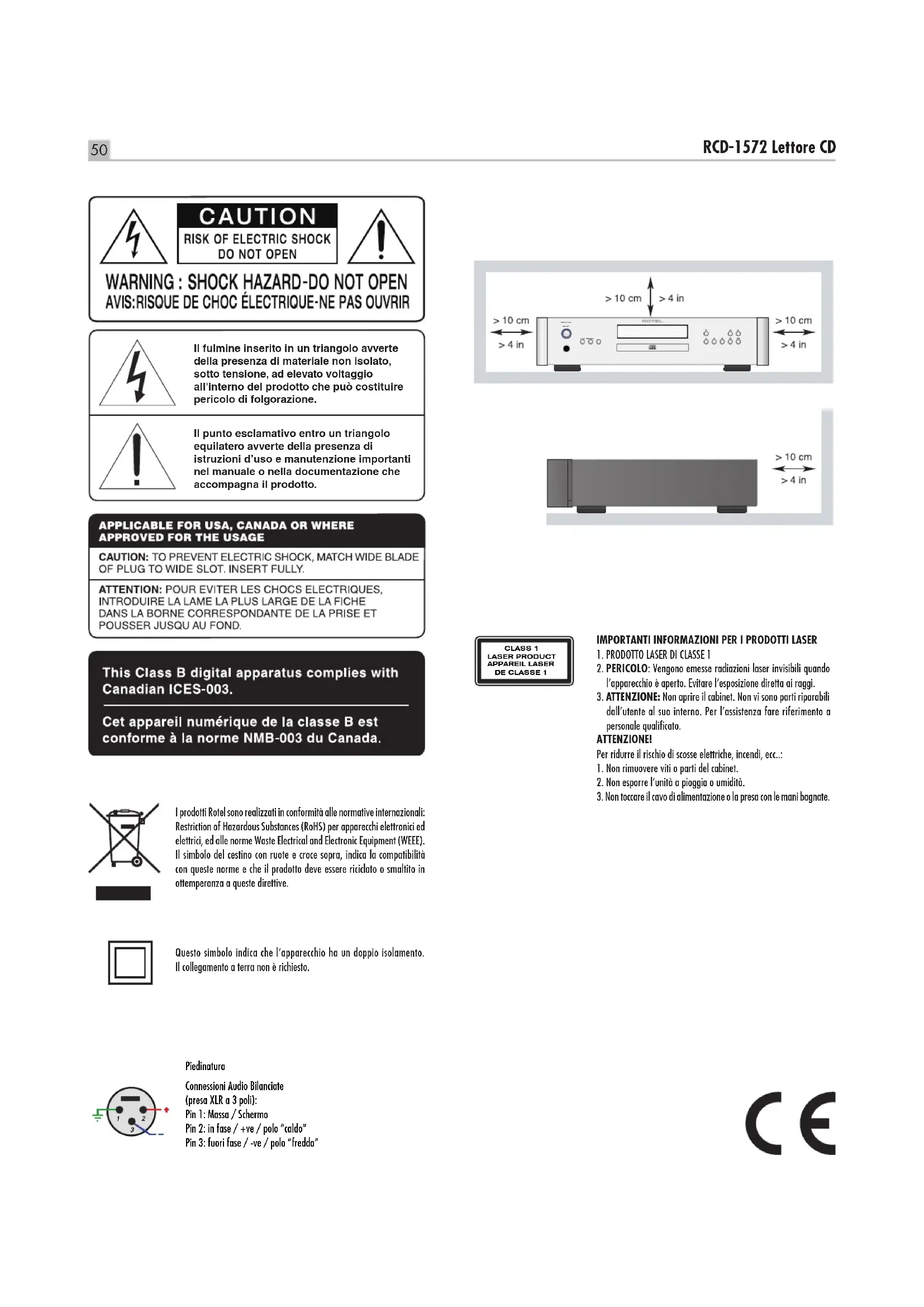 Piedinatura Connessioni Audio Bilanciate (presa XLR a 3 poli): Pin 1: Massa / Schermo Pin 2: in fase / +ve / polo “caldo” Pin 3: fuori fase / -ve / polo “freddo” CLASS 1LASER PRODUCT APPAREIL LASER DE CLASSE 151 Italiano Nota La connessione RS 232 deve essere utilizzata solo da personale autorizzato. ATTENZIONE: Non vi sono all’interno parti riparabili dall’utente. Per l’assistenza fare riferimento a personale qualificato. ATTENZIONE: Per ridurre il rischio di incendio e di scossa elettrica non esporre l’apparecchio all’umidità o all’acqua. Non posizionare contenitori d’acqua, ad esempio vasi, sull’unità. Evitare che cadano oggetti all’interno del cabinet. Se l’apparecchio è stato esposto all’umidità o un oggetto è caduto all’interno del cabinet, staccare immediatamente il cavo di alimentazione dalla presa elettrica. Portare l’apparecchio ad un centro di assistenza qualificato per i necessari controlli e riparazioni. Leggere attentamente tutte le istruzioni. Conservare questo manuale. Seguire attentamente tutte le avvertenze. Seguire tutte le istruzioni d’uso. Non utilizzare il prodotto vicino all’acqua. Pulire il cabinet solo con un panno asciutto. Non posizionare l’apparecchio su un letto, divano, tappeto, o superfici che possano bloccare le aperture di ventilazione. Se l’apparecchio è collocato in una libreria o in mobile apposito, fare in modo che vi sia abbastanza spazio attorno all’unità per consentire la ventilazione ed un adeguato raffreddamento. Tenerlo lontano da fonti di calore come caloriferi, termoconvettori, stufe o altri apparecchi che generano calore. Non cercare di eliminare la messa a terra o la polarizzazione. Se la spina del cavo di alimentazione fornito in dotazione non corrisponde allo standard delle vostra presa consultate un elettricista per la sostituzione di quest’ultima. Non far passare il cavo di alimentazione dove potrebbe venir schiacciato, pizzicato, piegato eccessivamente, esposto al calore o danneggiato. Fare particolare attenzione al posizionamento del cavo di alimentazione in corrispondenza della presa elettrica e nel punto in cui esce dalla parte posteriore dell’apparecchio. Usare esclusivamente accessori indicati dal produttore. Utilizzare solo stand, scaffali o supporti abbastanza forte per sostenere la prodotto. Prestare molta cautela nel muoverlo quando si trova su un supporto o uno scaffale per evitare di ferirvi o danni al la prodotto in caso di caduta. Il cavo di alimentazione deve essere scollegato dalla presa elettrica durante forti temporali con fulmini e quando l’apparecchiatura rimane inutilizzata per un lungo periodo di tempo. L’apparecchio non deve più essere utilizzato e fatto ispezionare da personale qualificato quando: il cavo di alimentazione o la spina sono stati danneggiati; sono caduti oggetti o liquidi all’interno dell’apparecchio; è stato esposto alla pioggia; non sembra funzionare in modo normale; è caduto o è stato in qualche modo danneggiato. L’apparato dovrebbe essere usato in un clima non tropicale. La ventilazione non dovrebbe essere impedita coprendo le aperture di ventilazione con oggetti come giornali, tovaglie, tende, ecc. Nessuna fonte di fiamme libere, come candele accese, dovrebbe essere collocata sull’apparecchio. Il contatto con terminali o cavi non isolati può provocare una sensazione spiacevole. Importanti informazioni di sicurezza Lasciare almeno 10 cm di spazio libero su tutti i lati del prodotto. ATTENZIONE: La presa del cavo di alimentazione sul pannello posteriore è il mezzo principale per scollegare l’apparecchio dall’alimentazione. Posizionarlo quindi in modo tale che la presa sia sempre facilmente accessibile. L’apparecchio deve essere collegato esclusivamente ad un’alimentazione elettrica del tipo indicato sul pannello posteriore. (USA:120V/60Hz, CE: 230V/50Hz). Collegare l’unità alla presa di alimentazione solo con il cavo fornito o con un esatto equivalente. Non modificare il cavo in dotazione in alcun modo. Non utilizzare prolunghe. La presa del cavo di alimentazione sul pannello posteriore è il mezzo principale per scollegare l’apparecchio dall’alimentazione. Staccare fisicamente il cavo sia dalla presa elettrica a muro, sia dall’apparecchio. Questo è l’unico modo per isolarlo completamente dall’alimentazione elettrica. Le batterie del telecomando non devono essere esposte ad eccessivo calore come raggi di sole, fuoco o simili. Smaltire le batterie esaurite come prescritto. Informazione FCC Questo dispositivo è stato esaminato e definito conforme ai limiti previsti per i dispositivi digitali di Classe B secondo il regolamento FCC, Parte 15. Questi limiti sono concepiti per fornire una ragionevole protezione contro interferenze pericolose in ambiente residenziali. Questo apparecchio genera, usa e può irradiare energia a radiofrequenza e, qualora non installato ed utilizzato secondo le presenti istruzioni, può causare interferenze nocive alle comunicazioni radio. Non vi è, tuttavia, alcuna garanzia che tali interferenze non si verifichino in una particolare installazione. Se il presente dispositivo dovesse generare interferenze nocive alla ricezione radio o televisiva, fenomeno che può essere determinato dall’accensione/spegnimento dell’apparecchio stesso, è possibile tentare di eliminare queste interferenze in uno o più dei seguenti modi: