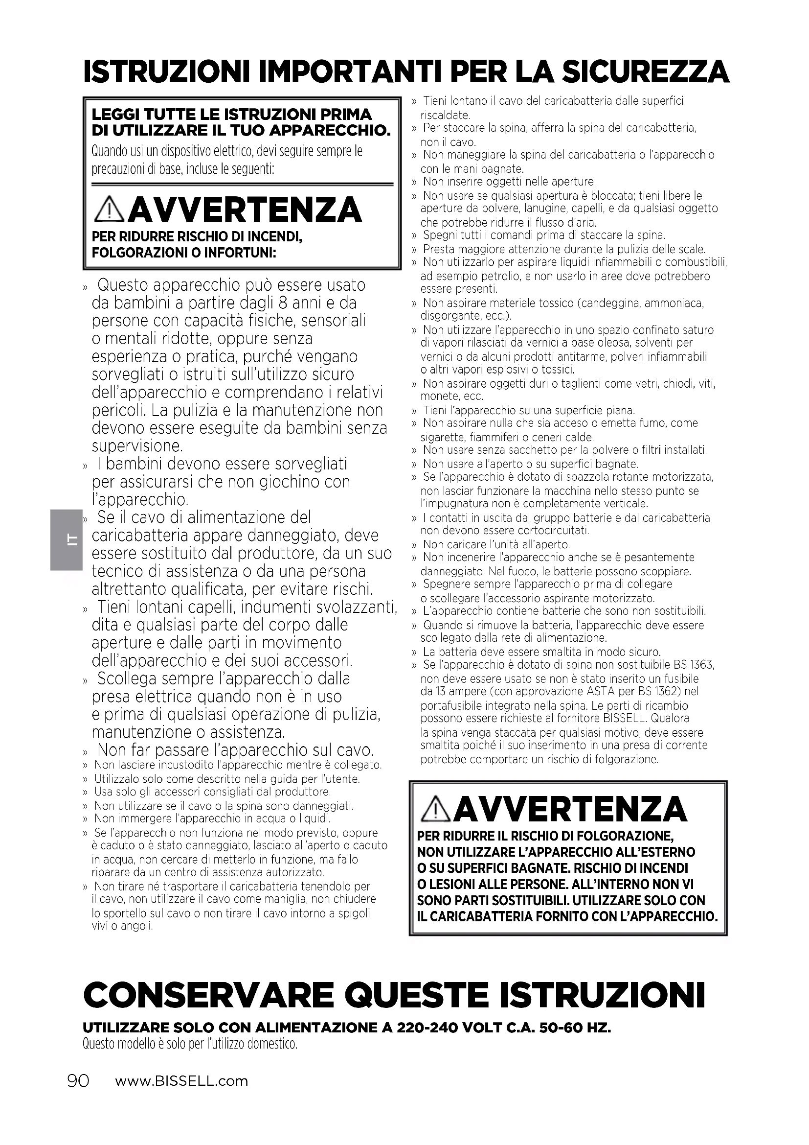 AVVERTENZA PER RIDURRE RISCHIO DI INCENDI, FOLGORAZIONI O INFORTUNI: » Questo apparecchio può essere usato da bambini a partire dagli 8 anni e da persone con capacità fisiche, sensoriali omentali ridotte, oppure senza esperienza o pratica, purché vengano sorvegliati oistruiti sull’utilizzo sicuro dell’apparecchio e comprendano i relativi pericoli. La pulizia e la manutenzione non devono essere eseguite da bambini senza supervisione. » I bambini devono essere sorvegliati per assicurarsi che non giochino con l’apparecchio. » Se il cavo di alimentazione del caricabatteria appare danneggiato, deve essere sostituito dal produttore, da un suo tecnico di assistenza o da una persona altrettanto qualificata, per evitare rischi. » Tieni lontani capelli, indumenti svolazzanti, dita e qualsiasi parte del corpo dalle aperture e dalle parti in movimento dell’apparecchio e dei suoi accessori. » Scollega sempre l’apparecchio dalla presa elettrica quando non è in uso eprima di qualsiasi operazione di pulizia, manutenzione o assistenza. » Non far passare l’apparecchio sul cavo.» Non lasciare incustodito l’apparecchio mentre è collegato.» Utilizzalo solo come descritto nella guida per l’utente.» Usa solo gli accessori consigliati dal produttore.» Non utilizzare se il cavo o la spina sono danneggiati.» Non immergere l’apparecchio in acqua o liquidi.» Se l’apparecchio non funziona nel modo previsto, oppure ècaduto o è stato danneggiato, lasciato all’aperto o caduto in acqua, non cercare di metterlo in funzione, ma fallo riparare da un centro di assistenza autorizzato.» Non tirare né trasportare il caricabatteria tenendolo per ilcavo, non utilizzare il cavo come maniglia, non chiudere losportello sul cavo o non tirare il cavo intorno a spigoli vivio angoli.» Tieni lontano il cavo del caricabatteria dalle superfici riscaldate.» Per staccare la spina, afferra la spina del caricabatteria, nonilcavo.» Non maneggiare la spina del caricabatteria o l’apparecchio con le mani bagnate.» Non inserire oggetti nelle aperture.» Non usare se qualsiasi apertura è bloccata; tieni libere le aperture da polvere, lanugine, capelli, e da qualsiasi oggetto che potrebbe ridurre il flusso d’aria.» Spegni tutti i comandi prima di staccare la spina.» Presta maggiore attenzione durante la pulizia delle scale.» Non utilizzarlo per aspirare liquidi infiammabili o combustibili, ad esempio petrolio, e non usarlo in aree dove potrebbero essere presenti.» Non aspirare materiale tossico (candeggina, ammoniaca, disgorgante, ecc.).» Non utilizzare l’apparecchio in uno spazio confinato saturo divapori rilasciati da vernici a base oleosa, solventi per vernici o da alcuni prodotti antitarme, polveri infiammabili oaltri vapori esplosivi o tossici.» Non aspirare oggetti duri o taglienti come vetri, chiodi, viti, monete, ecc.» Tieni l’apparecchio su una superficie piana.» Non aspirare nulla che sia acceso o emetta fumo, come sigarette, fiammiferi o ceneri calde.» Non usare senza sacchetto per la polvere o filtri installati.» Non usare all’aperto o su superfici bagnate.» Se l’apparecchio è dotato di spazzola rotante motorizzata, non lasciar funzionare la macchina nello stesso punto se l’impugnatura non è completamente verticale.» I contatti in uscita dal gruppo batterie e dal caricabatteria non devono essere cortocircuitati.» Non caricare l’unità all’aperto.» Non incenerire l’apparecchio anche se è pesantemente danneggiato. Nel fuoco, le batterie possono scoppiare.» Spegnere sempre l’apparecchio prima di collegare oscollegare l’accessorio aspirante motorizzato.» L’apparecchio contiene batterie che sono non sostituibili.» Quando si rimuove la batteria, l’apparecchio deve essere scollegato dalla rete di alimentazione.» La batteria deve essere smaltita in modo sicuro.» Se l’apparecchio è dotato di spina non sostituibile BS 1363, non deve essere usato se non è stato inserito un fusibile da 13 ampere (con approvazione ASTA per BS 1362) nel portafusibile integrato nella spina. Le parti di ricambio possono essere richieste al fornitore BISSELL. Qualora laspina venga staccata per qualsiasi motivo, deve essere smaltita poiché il suo inserimento in una presa di corrente potrebbe comportare un rischio di folgorazione.