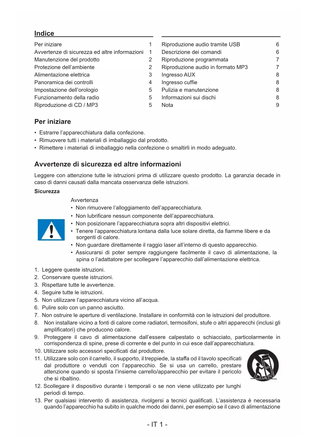 - Non riprodurre musica a volume troppo elevato per evitare il rischio di danni all'udito e/o all'apparecchio stesso.