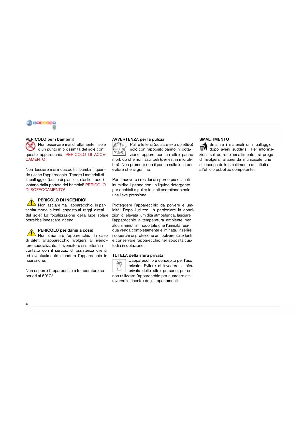 Scarica le istruzioni per il tuo Telescopio in formato PDF gratuitamente! Trova il tuo manuale 70900 NG - BRESSER e riprendi in mano il tuo dispositivo elettronico. In questa pagina sono pubblicati tutti i documenti necessari per l'utilizzo del tuo dispositivo. 70900 NG del marchio BRESSER.