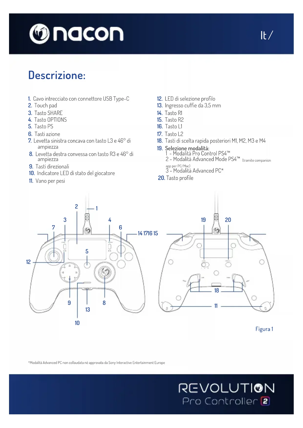 Bilanciamento del peso: Figura 2It / REVOLUTION Pro Controller 2 Grazie per avere acquistato questo prodotto NACON. In caso di malfunzionamento, consulta le informazioni di assistenza alla fine di questo manuale. Apprezziamo qualsiasi feedback che ci aiuti a migliorare i nostri prodotti. Conserva questo manuale di istruzioni per consultarlo in futuro. Garanzia Questo prodotto a marchio NACON è garantito dal produttore Bigben Interactive per un periodo di 2 anni dalla data d’acquisto e, nel corso di questo periodo, in caso di difetti di materiali o di costruzione, verrà sostituito gratuita- mente con lo stesso modello o uno simile a nostra discrezione. Questa garanzia può essere esercitata con la prova di acquisto a supporto (ad es. Ricevuta di denaro, ricevuta della transazione Internet, ...) e imballaggio se l’acquisto è stato effettuato su Internet o per corrispondenza. Per quanto riguarda la sostituzione del cavo del controller, sarà accettata solo una sostituzione all’anno durante il pe- riodo di garanzia. Superata tale sostituzione in garanzia si dovrà restituire il controller con il suo cavo per un controllo effettuato da un esperto nel nostro laboratorio di test. Questa garanzia non copre danni dovuti a cause accidentali, uso improprio, torsioni del cavo o avvolgimento del cavo attorno al controller. La garanzia è valida solo per l’acquirente originale del controller. Non influisce in alcun modo sui diritti dell’utente riconosciuti dalla legge. Per ulteriore assistenza e informazioni sulla garanzia, scrivi a support.it@nacongaming.com o visita il sito www. nacongaming.com Contenuto della confezione 1 x REVOLUTION Pro Controller 2 1 x cavo di connessione di 3 metri 1 x manuale di istruzioni 2 x pesi da 10 grammi 2 x pesi da 14 grammi 2 x pesi da 17 grammi 1 x chiavetta per vano pesi 1 x custodia Caratteristiche Questo controller offre la possibilità di giocare in tre diverse modalità: Modalità 1 = Pro Control PS4™ (cfr. sezione 2) Modalità 2 = Advanced PS4™ (cfr. sezione 3) Modalità 3 = Advanced PC (cfr. sezione 4)It / Figura 3 1/ Come usare il REVOLUTION Pro Controller 2 Nota: non toccare le levette o i grilletti durante l’operazione di collegamento del controller al sistema PS4™.