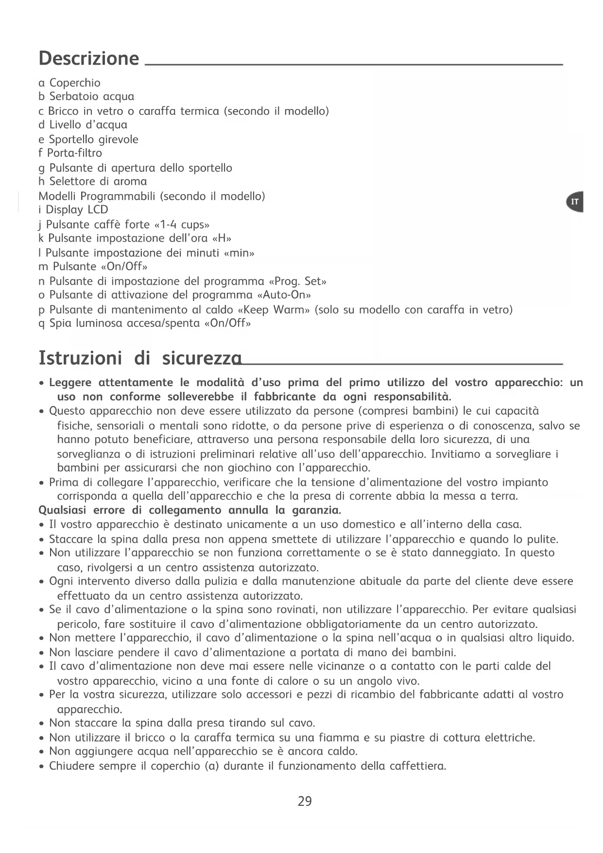 - Il vostro apparecchio è destinato unicamente a un uso domestico e all’interno della casa.