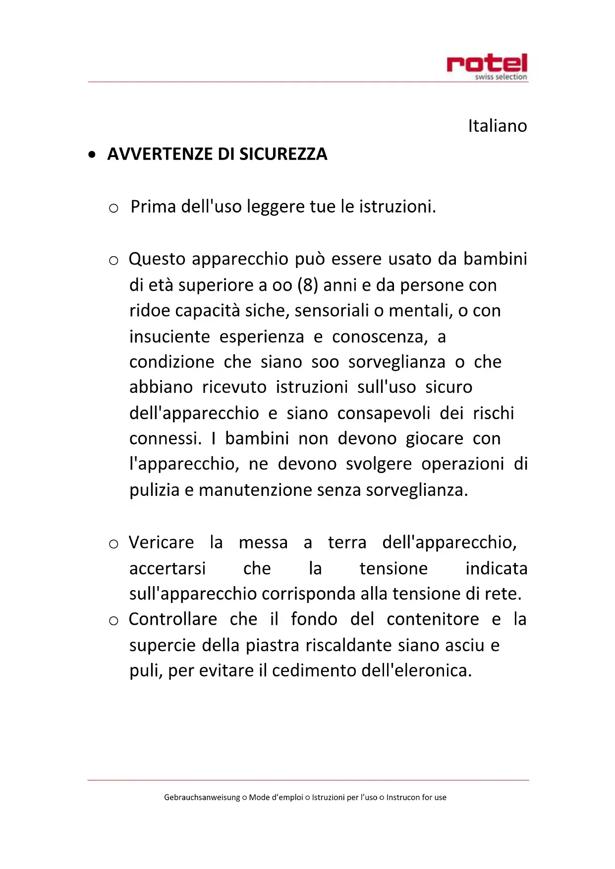 - Questo apparecchio può essere usato da bambini di età superiore a oo (8) anni e da persone con ridoe capacità siche, sensoriali o mentali, o con insuciente esperienza e conoscenza, a condizione che siano soo sorveglianza o che abbiano ricevuto istruzioni sull'uso sicuro dell'apparecchio e siano consapevoli dei rischi connessi. I bambini non devono giocare con l'apparecchio, ne devono svolgere operazioni di pulizia e manutenzione senza sorveglianza.