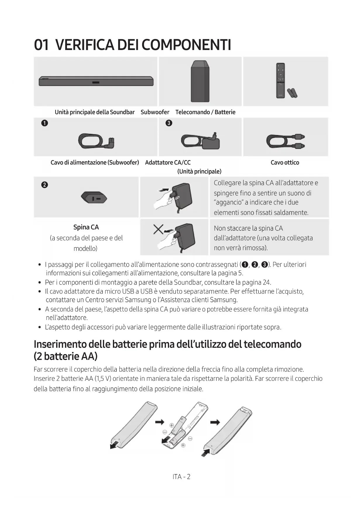 contengono sostanze chimiche dannose per l’ambiente. Non smaltirle con i comuni riuti domestici. Non gettare le batterie nel fuoco. Non cortocircuitare, smontare o surriscaldare le batterie. Una installazione scorretta delle batterie può causarne l’esplosione. Sostituire solo con batterie dello stesso tipo o equivalenti. INFORMAZIONI SUL MANUALE Il manuale utente è composto da due parti: il presente MANUALE UTENTE semplicato in formato cartaceo e un MANUALE COMPLETO dettagliato che è possibile scaricare. MANUALE UTENTE Consultare questo manuale per istruzioni di sicurezza, informazioni sull’installazione del prodotto, i componenti, i collegamenti e le speciche del prodotto. MANUALE COMPLETO È possibile accedere al centro assistenza clienti scansionando il codice QR. Per visualizzare il manuale sul proprio PC o dispositivo mobile, scaricarlo dal sito in formato documento. (http://www.samsung.com/support) Le caratteristiche e le speciche sono soggette a modiche senza preavviso.ITA - iv SOMMARIO 01 Vericadeicomponenti 2 Inserimento delle batterie prima dell’utilizzo del telecomando (2 batterie AA) ------------------------- 2 02 Panoramicadelprodotto 3 Pannello frontale / Pannello laterale destro della Soundbar ------------------------- 3 Pannello inferiore della Soundbar ------------------------- 4 03 CollegamentodellaSoundbar 5 Collegamento alla rete elettrica
