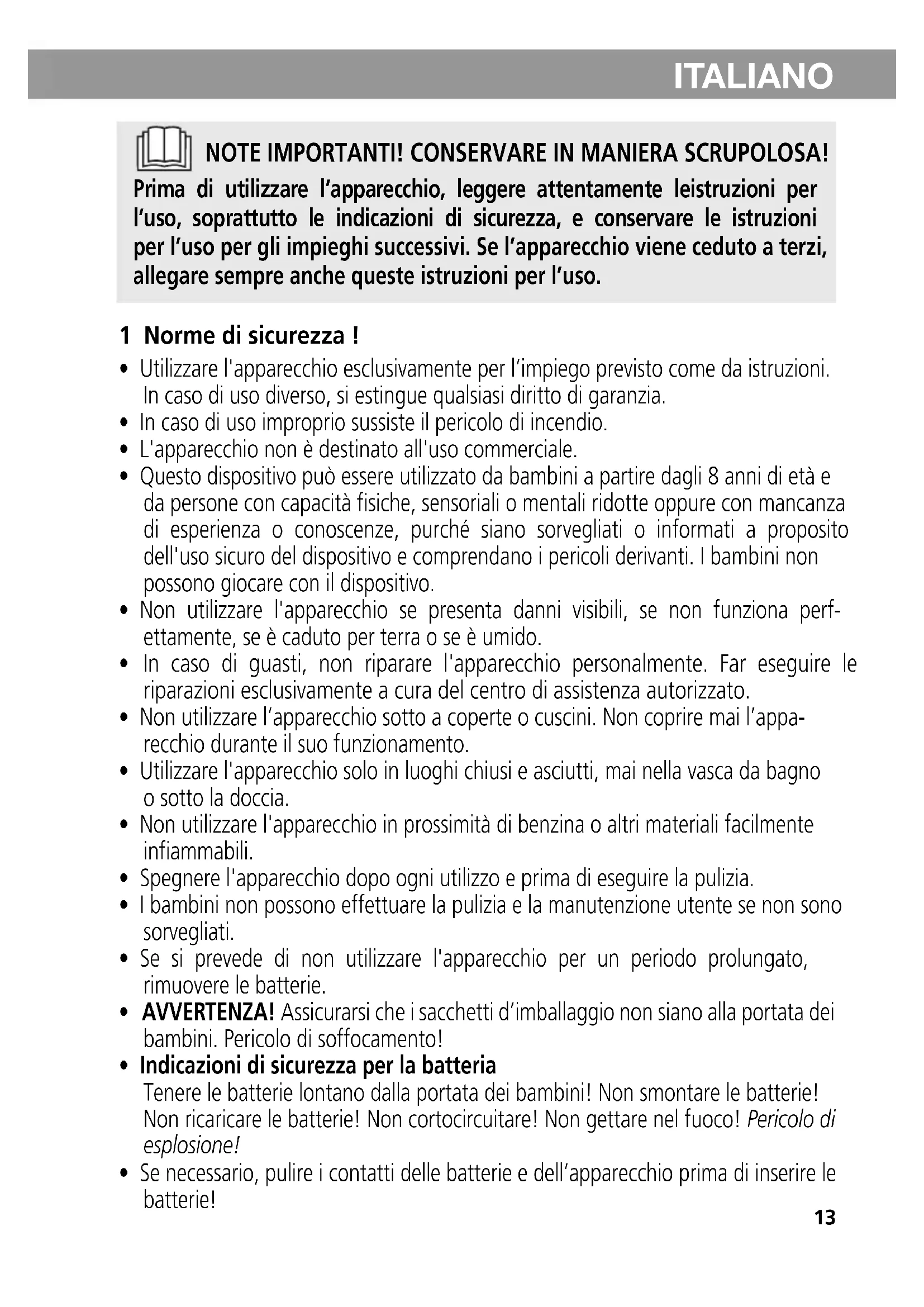 - In caso di lungo periodo di inutilizzo, rimuovere le batterie dal dispositivo!