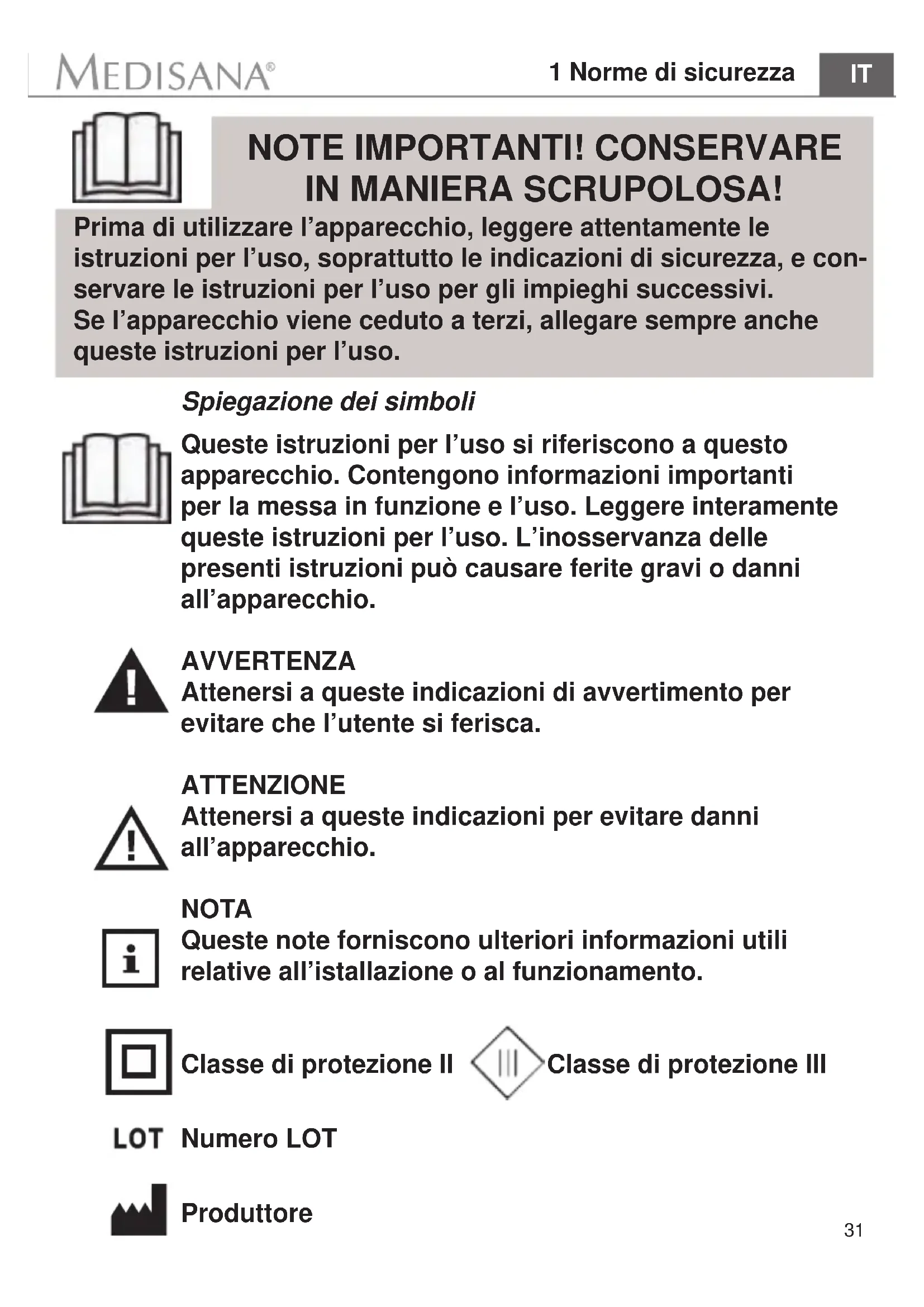 Spiegazione dei simboli Queste istruzioni per l’uso si riferiscono a questo apparecchio. Contengono informazioni importanti per la messa in funzione e l’uso. Leggere interamente queste istruzioni per l’uso. L’inosservanza delle presenti istruzioni può causare ferite gravi o danni all’apparecchio. AVVERTENZA Attenersi a queste indicazioni di avvertimento per evitare che l’utente si ferisca. ATTENZIONE Attenersi a queste indicazioni per evitare danni all’apparecchio. NOTA Queste note forniscono ulteriori informazioni utili relative all’istallazione o al funzionamento. Classe di protezione II Classe di protezione III Numero LOT Produttore Prima di utilizzare l’apparecchio, leggere attentamente le istruzioni per l’uso, soprattutto le indicazioni di sicurezza, e con- servare le istruzioni per l’uso per gli impieghi successivi. Se l’apparecchio viene ceduto a terzi, allegare sempre anche queste istruzioni per l’uso.