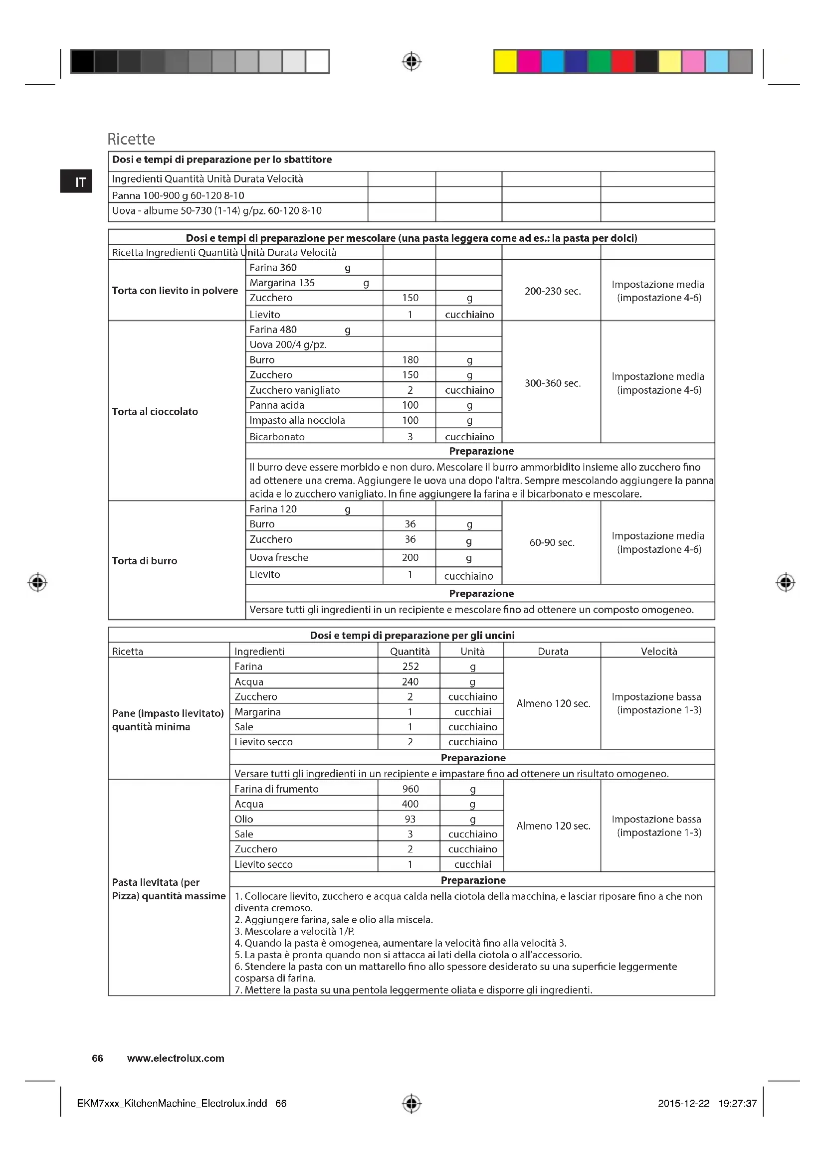 EKM7xxx_KitchenMachine_Electrolux.indd 65 2015-12-22 19:27:36IT Ricette Dosi e tempi di preparazione per lo sbattitore Ingredienti Quantità Unità Durata Velocità Panna 100-900 g 60-120 8-10 Uova - albume 50-730 (1-14) g/pz. 60-120 8-10 Dosi e tempi di preparazione per mescolare (una pasta leggera come ad es.: la pasta per dolci) Ricetta Ingredienti Quantità Unità Durata Velocità Torta con lievito in polvere Farina 360 g 200-230 sec. Impostazione media (impostazione 4-6) Margarina 135 g Zucchero 150 g Lievito 1 cucchiaino Torta al cioccolato Farina 480 g 300-360 sec. Impostazione media (impostazione 4-6) Uova 200/4 g/pz. Burro 180 g Zucchero 150 g Zucchero vanigliato 2 cucchiaino Panna acida 100 g Impasto alla nocciola 100 g Bicarbonato 3 cucchiaino Preparazione Il burro deve essere morbido e non duro. Mescolare il burro ammorbidito insieme allo zucchero no ad ottenere una crema. Aggiungere le uova una dopo l'altra. Sempre mescolando aggiungere la panna acida e lo zucchero vanigliato. In ne aggiungere la farina e il bicarbonato e mescolare. Torta di burro Farina 120 g 60-90 sec. Impostazione media (impostazione 4-6) Burro 36 g Zucchero 36