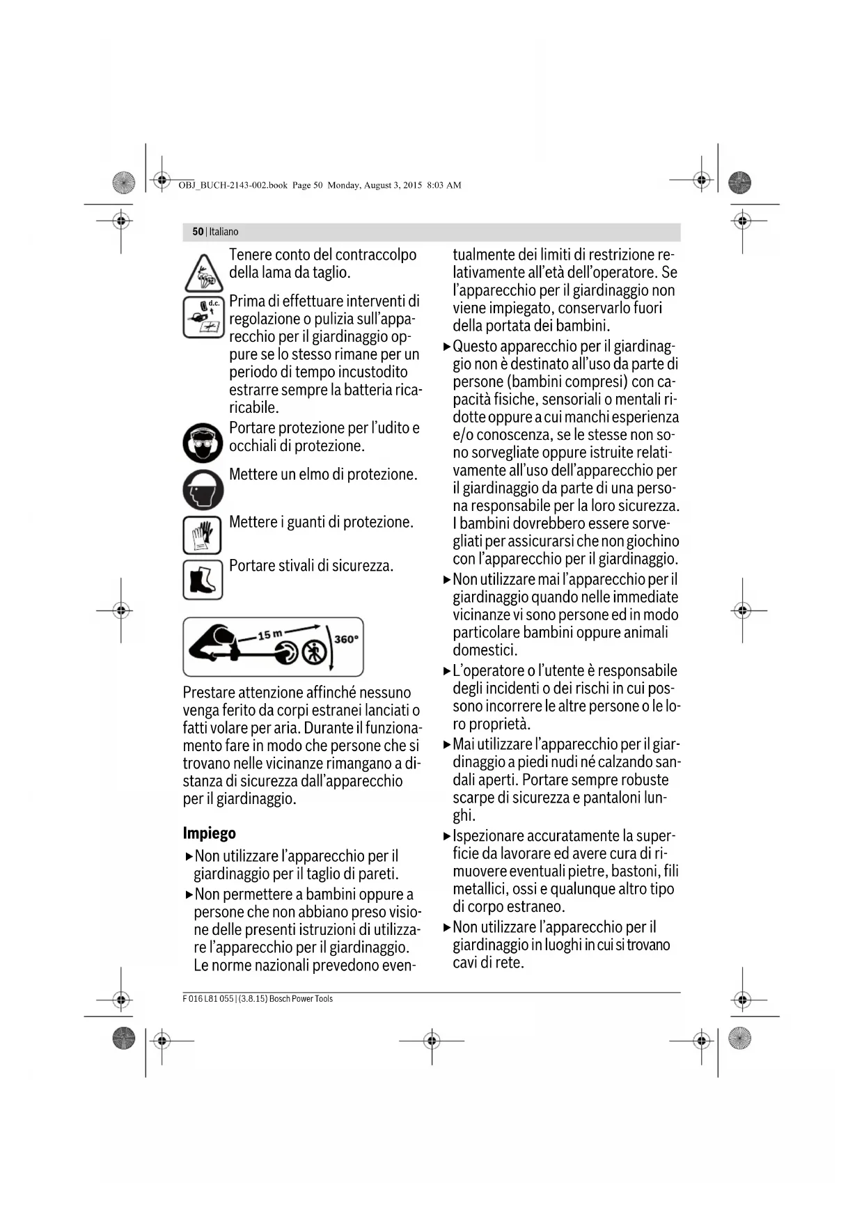 Sintomas Possível causa Solução OBJ_BUCH-2143-002.book Page 48 Monday, August 3, 2015 8:03 AMItaliano | 49 Bosch Power Tools F 016 L81 055 | (3.8.15) Serviço pós-venda e consultoria de aplicação www.bosch-professional.com Para todas as questões e encomendas de peças sobressalen- tes é imprescindível indicar o número de produto de 10 dígitos como consta na placa de características do apare- lho de jardim. Portugal Robert Bosch LDA Avenida Infante D. Henrique Lotes 2E – 3E 1800 Lisboa Para efetuar o seu pedido online de peças entre na página www.ferramentasbosch.com. Tel.: 21 8500000 Fax: 21 8511096 Brasil Robert Bosch Ltda. Caixa postal 1195 13065-900 Campinas Tel.: (0800) 7045446 www.bosch.com.br/contacto Transporte Os acumuladores de iões de lítio, contidos, estão sujeitos ao direito de materiais perigosos. Os acumuladores podem ser transportados na rua pelo utilizador, sem mais obrigações. Na expedição por terceiros (por ex.: transporte aéreo ou ex- pedição), devem ser observadas as especiais exigências quanto à embalagem e à designação. Neste caso é necessário consultar um especialista de materiais perigosos ao preparar a peça a ser trabalhada. Só enviar acumuladores se a carcaça não estiver danificada. Colar contactos abertos e embalar o acumulador de modo que não possa se movimentar dentro da embalagem. Por favor observe também eventuais diretivas nacionais su- plementares. Eliminação Não deitar os aparelhos de jardinagem, carregadores e acu- muladores/pilhas no lixo doméstico! Apenas países da União Europeia: Conforme as Diretivas Europeias 2012/19/UE relativa aos resíduos aparelhos elétricos e eletrónicos velhos e conforme a diretiva europeia 2006/66/CE relativa a acu- muladores/pilhas defeituosos ou gastos, es- tes devem ser removidos do aparelho e cole- tados separadamente. Descartar acumuladores mecanicamente danificados e que apresentem fugas, de mo- do compatível com o meio ambiente, de acordo com as direti- vas locais. Acumuladores/pilhas: Iões de lítio: Observar as indicações no capítulo “Trans- porte”. Sob reserva de alterações. Italiano Norme di sicurezza Attenzione! Leggere attentamente le istruzioni sotto indicate. Acquisire dimestichezza con gli elementi di co- mando ed il corretto utilizzo dell’ap- parecchio per il giardinaggio. Con- servare le istruzioni per l’uso in luogo sicuro per un eventuale impiego fu- turo. Utilizzare l’apparecchio solo se tutte le funzioni sono state comprese in modo preciso e lo stesso può essere utilizzato senza limitazioni o se è sta- ta ricevuta adeguata istruzione. Spiegazione dei simboli presenti sull’apparecchio per il giardinaggio Allarme generale di pericolo. Leggere le istruzioni d’uso. Attenzione a non mettere in pe- ricolo l’incolumità di persone che si trovano nelle vicinanze attraverso corpi lanciati o fatti volare per aria. Avvertenza: Tenere una distan- za di sicurezza dall’apparecchio per il giardinaggio se lo stesso sta lavorando. OBJ_BUCH-2143-002.book Page 49 Monday, August 3, 2015 8:03 AM50 | Italiano F 016 L81 055 | (3.8.15) Bosch Power Tools Tenere conto del contraccolpo della lama da taglio. Prima di effettuare interventi di regolazione o pulizia sull’appa- recchio per il giardinaggio op- pure se lo stesso rimane per un periodo di tempo incustodito estrarre sempre la batteria rica- ricabile. Portare protezione per l’udito e occhiali di protezione. Mettere un elmo di protezione. Mettere i guanti di protezione. Portare stivali di sicurezza. Prestare attenzione affinché nessuno venga ferito da corpi estranei lanciati o fatti volare per aria. Durante il funziona- mento fare in modo che persone che si trovano nelle vicinanze rimangano a di- stanza di sicurezza dall’apparecchio per il giardinaggio. Impiego Non utilizzare l’apparecchio per il giardinaggio per il taglio di pareti. Non permettere a bambini oppure a persone che non abbiano preso visio- ne delle presenti istruzioni di utilizza- re l’apparecchio per il giardinaggio. Le norme nazionali prevedono even- tualmente dei limiti di restrizione re- lativamente all’età dell’operatore. Se l’apparecchio per il giardinaggio non viene impiegato, conservarlo fuori della portata dei bambini. Questo apparecchio per il giardinag- gio non è destinato all’uso da parte di persone (bambini compresi) con ca- pacità fisiche, sensoriali o mentali ri- dotte oppure a cui manchi esperienza e/o conoscenza, se le stesse non so- no sorvegliate oppure istruite relati- vamente all’uso dell’apparecchio per il giardinaggio da parte di una perso- na responsabile per la loro sicurezza. I bambini dovrebbero essere sorve- gliati per assicurarsi che non giochino con l’apparecchio per il giardinaggio. Non utilizzare mai l’apparecchio per il giardinaggio quando nelle immediate vicinanze vi sono persone ed in modo particolare bambini oppure animali domestici. L’operatore o l’utente è responsabile degli incidenti o dei rischi in cui pos- sono incorrere le altre persone o le lo- ro proprietà. Mai utilizzare l’apparecchio per il giar- dinaggio a piedi nudi né calzando san- dali aperti. Portare sempre robuste scarpe di sicurezza e pantaloni lun- ghi. Ispezionare accuratamente la super- ficie da lavorare ed avere cura di ri- muovere eventuali pietre, bastoni, fili metallici, ossi e qualunque altro tipo di corpo estraneo. Non utilizzare l’apparecchio per il giardinaggio in luoghi in cui si trovano cavi di rete. d.c. OBJ_BUCH-2143-002.book Page 50 Monday, August 3, 2015 8:03 AMItaliano | 51 Bosch Power Tools F 016 L81 055 | (3.8.15) Prima dell’impiego controllare sem- pre se lama da taglio, dado per lama da taglio o rocchetto sono usurati o danneggiati. Al fine di evitare squilibri, in caso di usura o danneggiamento delle lame da taglio e dei dadi della lama da ta- glio sostituire sempre la serie com- pleta. Lavorare solamente di giorno o con una buona illuminazione artificiale. Con cattive co