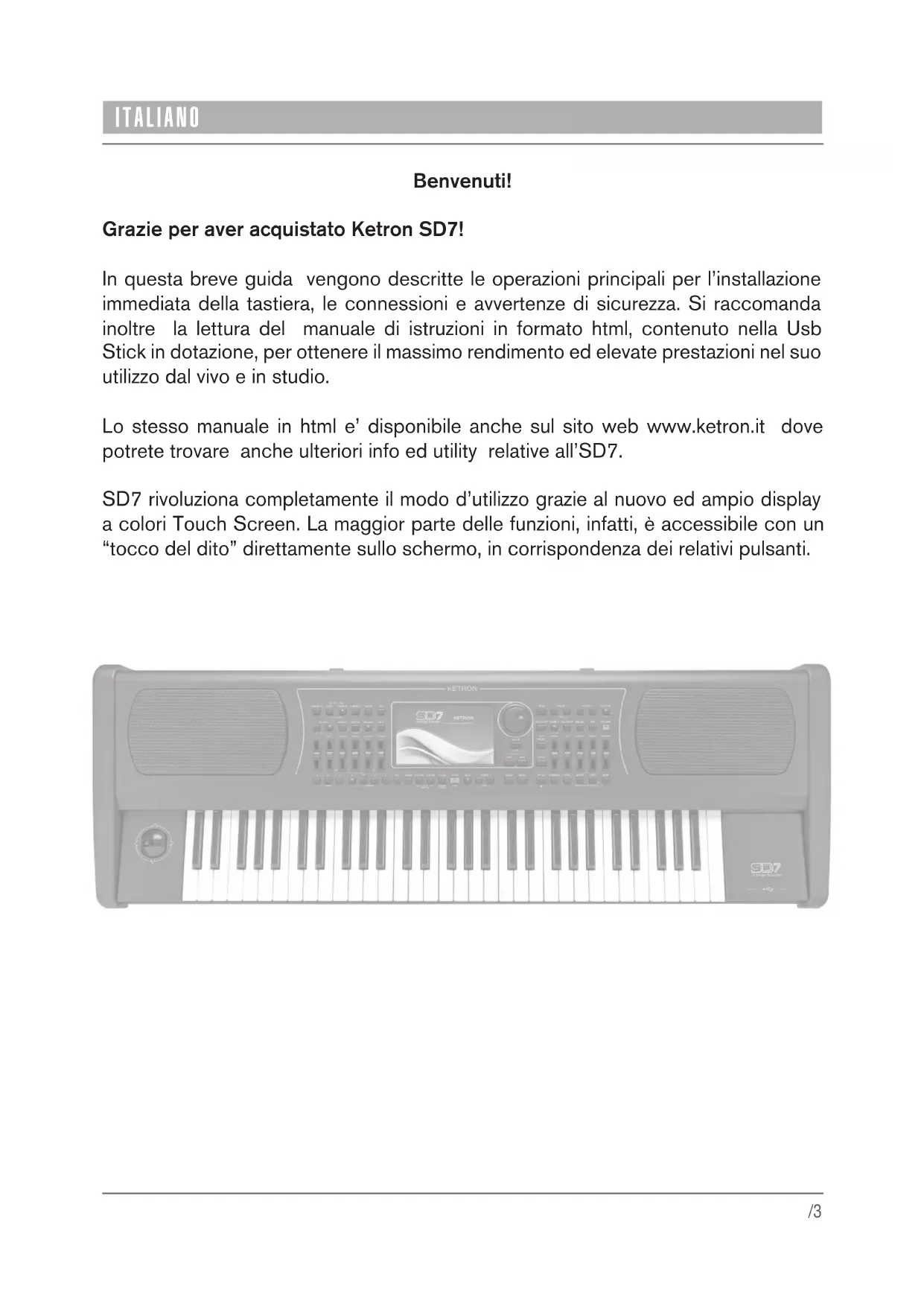 INDEX PAGE ITALIANO 3 ENGLISH 7 DEUTSCH 11 FRANÇAIS 15 ESPAÑOL 19 PORTUGUÊS 23 TECHNICAL TABLE 27/3 ITALIANO Benvenuti! Grazie per aver acquistato Ketron SD7! In questa breve guida vengono descritte le operazioni principali per l’installazione immediata della tastiera, le connessioni e avvertenze di sicurezza. Si raccomanda inoltre la lettura del manuale di istruzioni in formato html, contenuto nella Usb Stick in dotazione, per ottenere il massimo rendimento ed elevate prestazioni nel suo utilizzo dal vivo e in studio. Lo stesso manuale in html e’ disponibile anche sul sito web www.ketron.it dove potrete trovare anche ulteriori info ed utility relative all’SD7. SD7 rivoluziona completamente il modo d’utilizzo grazie al nuovo ed ampio display a colori Touch Screen. La maggior parte delle funzioni, infatti, è accessibile con un “tocco del dito” direttamente sullo schermo, in corrispondenza dei relativi pulsanti./4 ISTRUZIONI PER LA SICUREZZA E L’INSTALLAZIONE ISTRUZIONI RIGUARDANTI IL RISCHIO DI INCENDIO, SCOSSE ELETTRICHE O DANNO ALLE PERSONE. AVVERTENZA: per ridurre il rischio di incendio o scosse elettriche, non esporre lo strumento alla pioggia o umidità. ISTRUZIONI IMPORTANTI PER LA SICUREZZA E L’INSTALLAZIONE AVVERTENZA: usando prodotti elettrici, dovete seguire alcune precauzioni di base tra cui le seguenti: