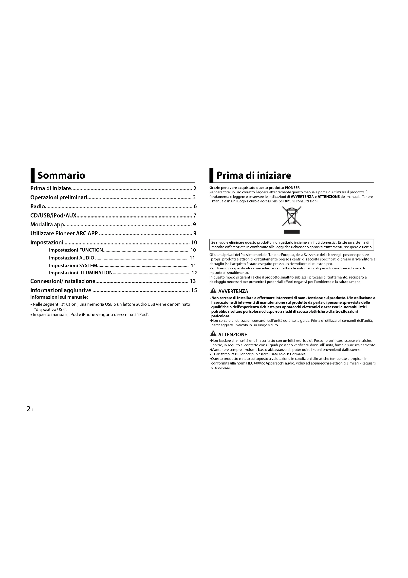 - In questo manuale, iPod e iPhone vengono denominati “iPod”. Sommario Grazie per avere acquistato questo prodotto PIONEERPer garantire un uso corretto, leggere attentamente questo manuale prima di utilizzare il prodotto. È fondamentale leggere e osservare le indicazioni di AVVERTENZA e AT T E NZ I O N E del manuale. Tenere il manuale in un luogo sicuro e accessibile per future consultazioni.Gli utenti privati dei Paesi membri dell’Unione Europea, della Svizzera e della Norvegia possono portare i propri prodotti elettronici gratuitamente presso i centri di raccolta specificati o presso il rivenditore al dettaglio (se l’acquisto è stato eseguito presso un rivenditore di questo tipo).Per i Paesi non specificati in precedenza, contattare le autorità locali per informazioni sul corretto metodo di smaltimento.In questo modo si garantirà che il prodotto smaltito subisca i processi di trattamento, recupero e riciclaggio necessari per prevenire i potenziali effetti negativi per l’ambiente e la salute umana. AVVERTENZA
