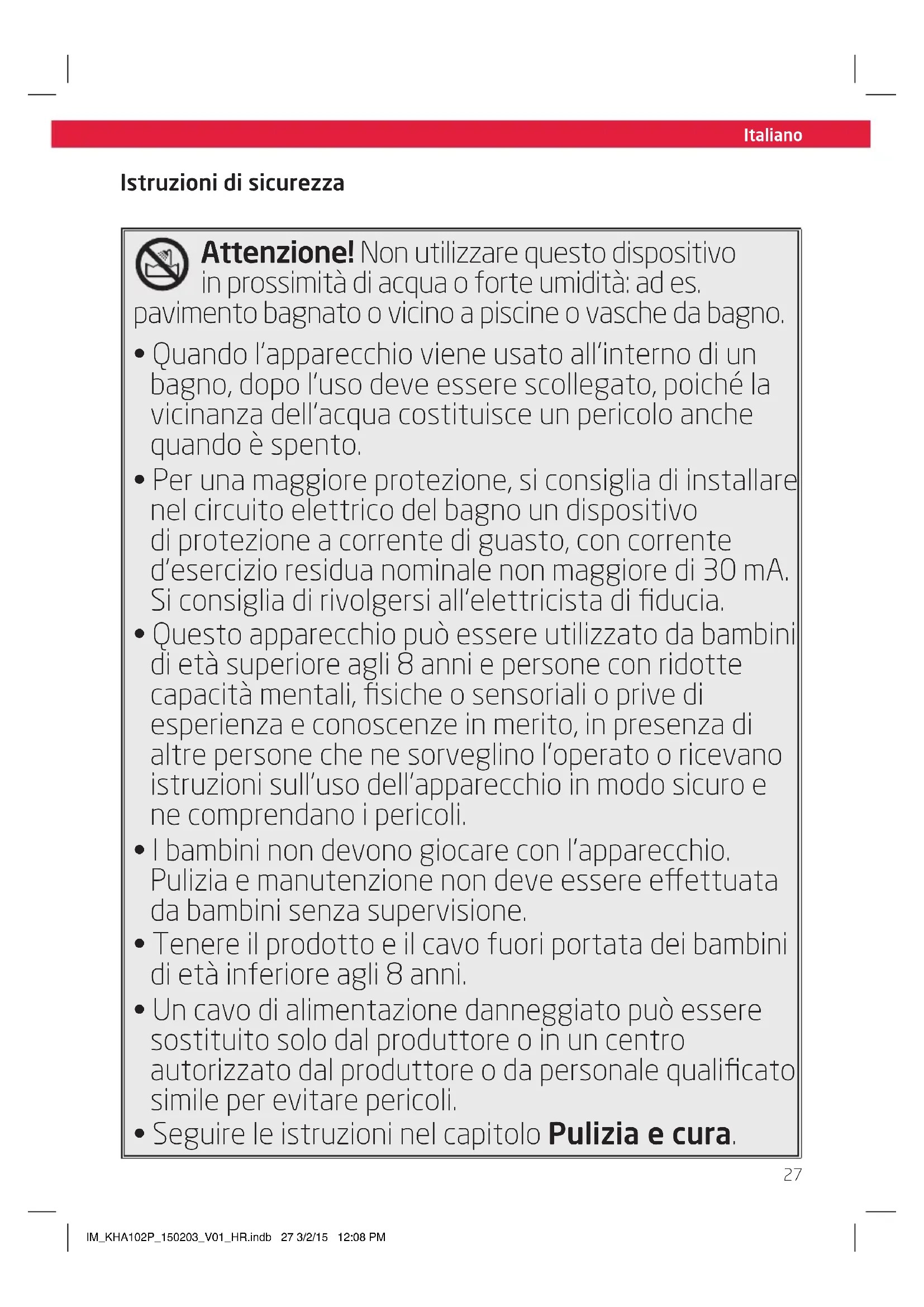 - Questo apparecchio può essere utilizzato da bambini di età superioreagli 8 anni e persone con ridotte capacità mentali, fisiche o sensoriali o prive di esperienza e conoscenze in merito, in presenza di altre persone che ne sorveglinol'operato o ricevano istruzioni sull'uso dell'apparecchio in modo sicuro e ne comprehendano i pericoli.