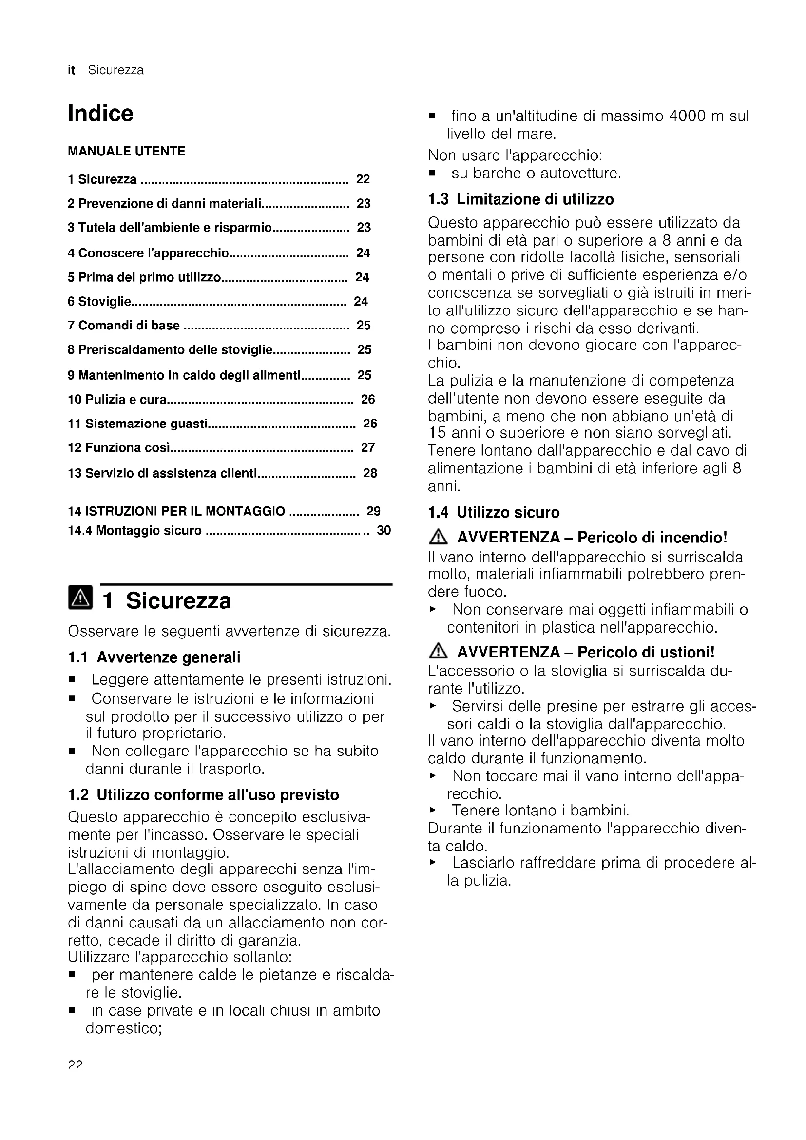 1 Sicurezza Osservare le seguenti avvertenze di sicurezza. 1.1 Avvertenze generali ¡ Leggere attentamente le presenti istruzioni. ¡ Conservare le istruzioni e le informazioni sul prodotto per il successivo utilizzo o per il futuro proprietario. ¡ Non collegare l'apparecchio se ha subito danni durante il trasporto. 1.2 Utilizzo conforme all'uso previsto Questo apparecchio è concepito esclusiva- mente per l'incasso. Osservare le speciali istruzioni di montaggio. L'allacciamento degli apparecchi senza l'im- piego di spine deve essere eseguito esclusi- vamente da personale specializzato. In caso di danni causati da un allacciamento non cor- retto, decade il diritto di garanzia. Utilizzare l'apparecchio soltanto: ¡ per mantenere calde le pietanze e riscalda- re le stoviglie. ¡ in case private e in locali chiusi in ambito domestico; ¡ fino a un'altitudine di massimo 4000m sul livello del mare. Non usare l'apparecchio: ¡ su barche o autovetture. 1.3 Limitazione di utilizzo Questo apparecchio può essere utilizzato da bambini di età pari o superiore a 8 anni e da persone con ridotte facoltà fisiche, sensoriali o mentali o prive di sufficiente esperienza e/o conoscenza se sorvegliati o già istruiti in meri- to all'utilizzo sicuro dell'apparecchio e se han- no compreso i rischi da esso derivanti. I bambini non devono giocare con l'apparec- chio. La pulizia e la manutenzione di competenza dell’utente non devono essere eseguite da bambini, a meno che non abbiano un’età di 15 anni o superiore e non siano sorvegliati. Tenere lontano dall'apparecchio e dal cavo di alimentazione i bambini di età inferiore agli 8 anni. 1.4 Utilizzo sicuro AVVERTENZA‒Pericolo di incendio! Il vano interno dell'apparecchio si surriscalda molto, materiali infiammabili potrebbero pren- dere fuoco. ▶ Non conservare mai oggetti infiammabili o contenitori in plastica nell'apparecchio. AVVERTENZA‒Pericolo di ustioni! L'accessorio o la stoviglia si surriscalda du- rante l'utilizzo. ▶ Servirsi delle presine per estrarre gli acces- sori caldi o la stoviglia dall'apparecchio. Il vano interno dell'apparecchio diventa molto caldo durante il funzionamento. ▶ Non toccare mai il vano interno dell'appa- recchio. ▶ Tenere lontano i bambini. Durante il funzionamento l'apparecchio diven- ta caldo. ▶ Lasciarlo raffreddare prima di procedere al- la pulizia.Prevenzione di danni materiali it
