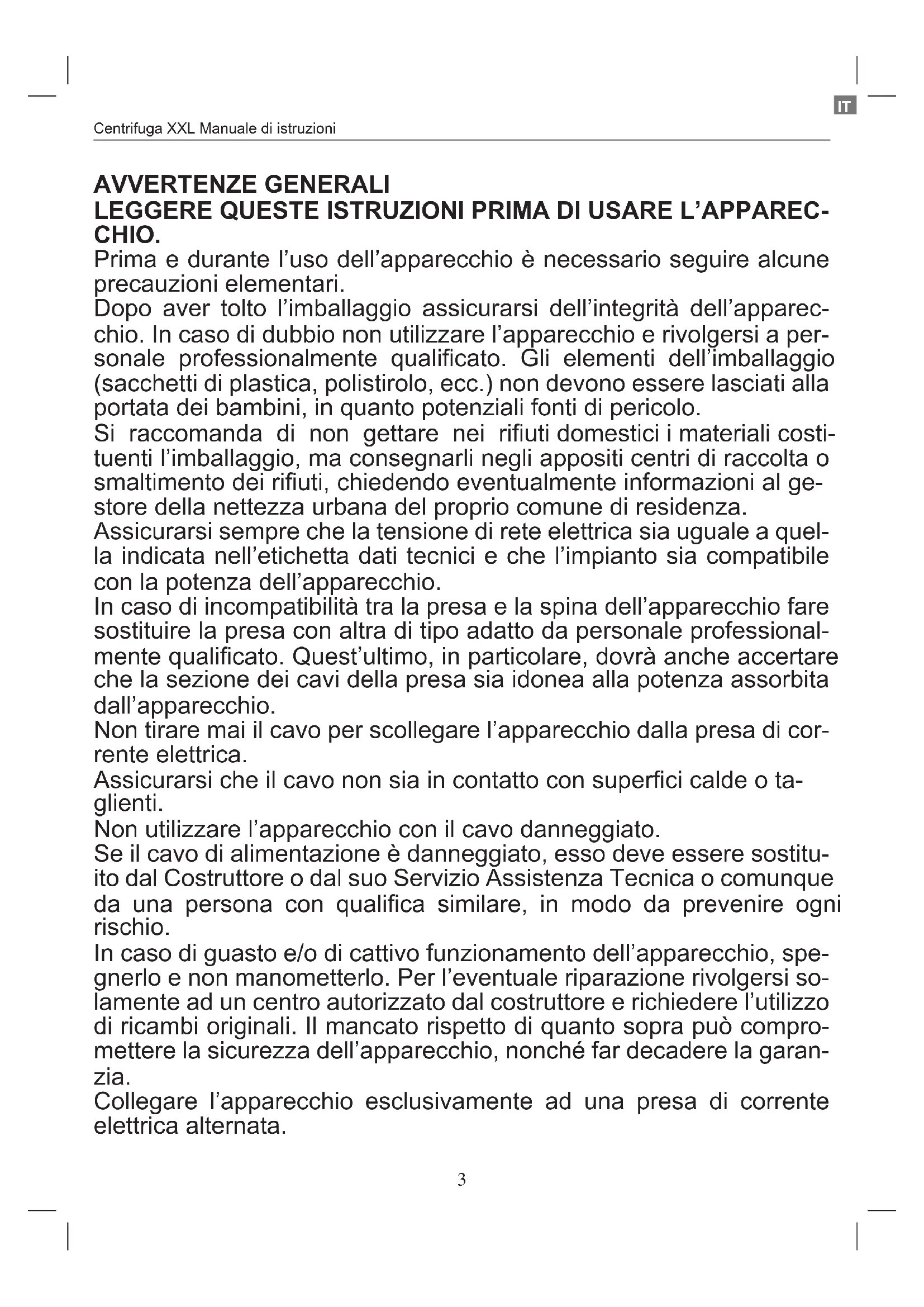 - prima di collegare l'apparecchio alla rete elettrica accertarsi che la tensione sia corretta secondo quando riportato sulla targa del prodotto e che l'impianto sia conforme alle norme vigenti