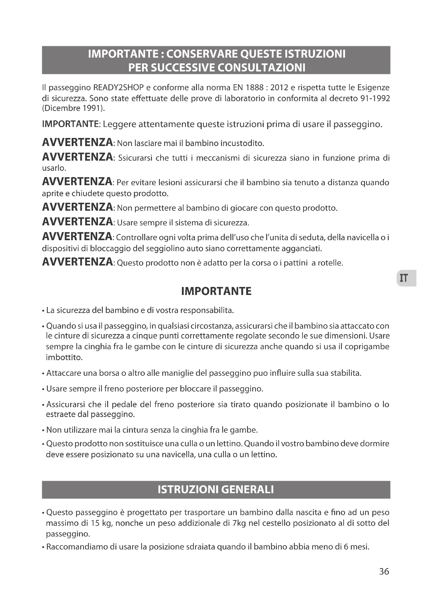 Il passeggino READY2SHOP e conforme alla norma EN 1888 : 2012 e rispetta tutte le Esigenze di sicurezza. Sono state eettuate delle prove di laboratorio in conformita al decreto 91-1992 (Dicembre 1991). IMPORTANTE: Leggere attentamente queste istruzioni prima di usare il passeggino. AVVERTENZA: Non lasciare mai il bambino incustodito. AVVERTENZA: Ssicurarsi che tutti i meccanismi di sicurezza siano in funzione prima di usarlo. AVVERTENZA: Per evitare lesioni assicurarsi che il bambino sia tenuto a distanza quando aprite e chiudete questo prodotto. AVVERTENZA: Non permettere al bambino di giocare con questo prodotto. AVVERTENZA: Usare sempre il sistema di sicurezza. AVVERTENZA: Controllare ogni volta prima dell’uso che l’unita di seduta, della navicella o i dispositivi di bloccaggio del seggiolino auto siano correttamente agganciati. AVVERTENZA: Questo prodotto non è adatto per la corsa o i pattini a rotelle. IMPORTANTE