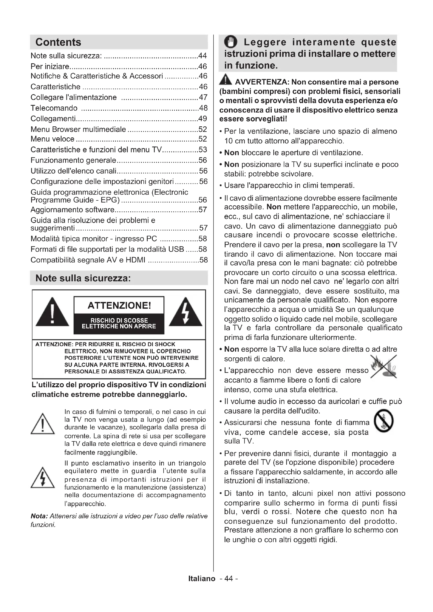 - -Italiano - 44 - Note sulla sicurezza: L’utilizzo del proprio dispositivo TV in condizioni climatiche estreme potrebbe danneggiarlo. ATTENZIONE! RISCHIO DI SCOSSE ELETTRICHE NON APRIREATTENZIONE: PER RIDURRE IL RISCHIO DI SHOCK ELETTRICO, NON RIMUOVERE IL COPERCHIO POSTERIORE L’UTENTE NON PUÒ INTERVENIRE SU ALCUNA PARTE INTERNA. RIVOLGERSI A PERSONALE DI ASSISTENZA QUALIFICATO.Nota: Attenersi alle istruzioni a video per l’uso delle relative funzioni.In caso di fulmini o temporali, o nel caso in cui la TV non venga usata a lungo (ad esempio durante le vacanze), scollegarla dalla presa di corrente. La spina di rete si usa per scollegare la TV dalla rete elettrica e deve quindi rimanere facilmente raggiungibile.Il punto esclamativo inserito in un triangolo equilatero mette in guardia l’utente sulla presenza di importanti istruzioni per il funzionamento e la manutenzione (assistenza) nella documentazione di accompagnamento l’apparecchio. Contents Note sulla sicurezza: p. 44