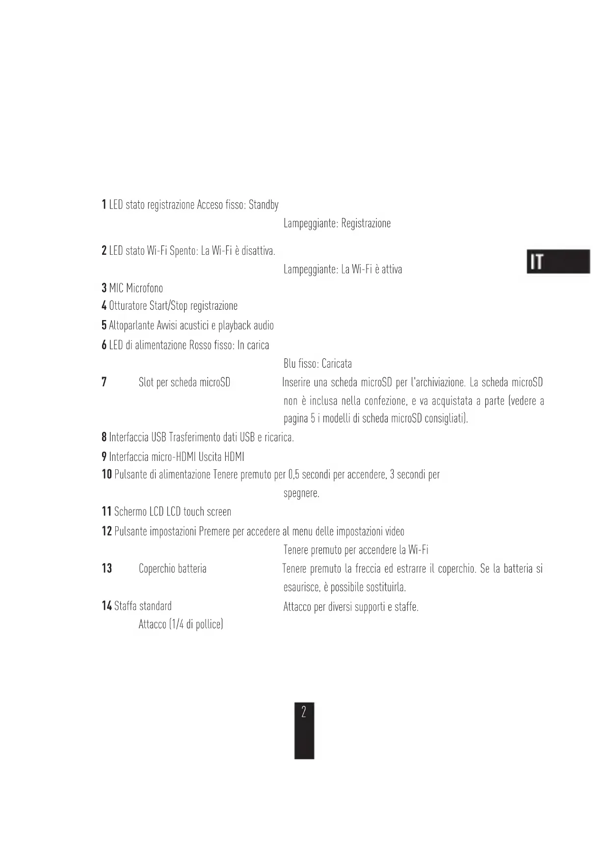 Elementi 11 LED stato registrazione Acceso fisso: Standby Lampeggiante: Registrazione 2 LED stato Wi-Fi Spento: La Wi-Fi è disattiva. Lampeggiante: La Wi-Fi è attiva 3 MIC Microfono 4 Otturatore Start/Stop registrazione 5 Altoparlante Avvisi acustici e playback audio 6 LED di alimentazione Rosso fisso: In carica Blu fisso: Caricata 7 Slot per scheda microSD Inserire una scheda microSD per l'archiviazione. La scheda microSD non è inclusa nella confezione, e va acquistata a parte (vedere a pagina 5 i modelli di scheda microSD consigliati). 8 Interfaccia USB Trasferimento dati USB e ricarica. 9 Interfaccia micro-HDMI Uscita HDMI 10 Pulsante di alimentazione Tenere premuto per 0,5 secondi per accendere, 3 secondi per spegnere. 11 Schermo LCD LCD touch screen 12 Pulsante impostazioni Premere per accedere al menu delle impostazioni video Tenere premuto per accendere la Wi-Fi 13 Coperchio batteria Tenere premuto la freccia ed estrarre il coperchio. Se la batteria si esaurisce, è possibile sostituirla. 14 Staffa standard Attacco (1/4 di pollice) Attacco per diversi supporti e staffe. 2Introduzione al display 00:00:00|02:00:00 4K/30/ Wide