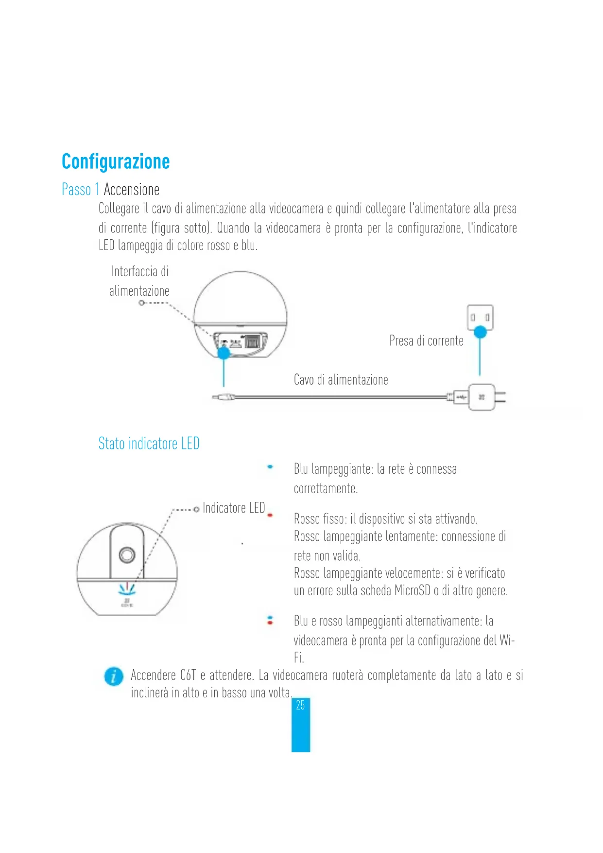 à un réseau Wi-Fi, elle se reconnectera automatiquement au même réseau Wi-Fi.24 Annexe Contenu du carton 1 C6T 1base 1câble d’alimentation 1gabarit de perçage 1kit de visserie 1adaptateur d’alimentation 1guide de démarrage rapide25 Configurazione Passo 1 Accensione Collegare il cavo di alimentazione alla videocamera e quindi collegare l'alimentatore alla presa di corrente (figura sotto). Quando la videocamera è pronta per la configurazione, l'indicatore LED lampeggia di colore rosso e blu. Presa di corrente Interfaccia di alimentazione Cavo di alimentazione Stato indicatore LED Blu lampeggiante: la rete è connessa correttamente. Rosso fisso: il dispositivo si sta attivando. Rosso lampeggiante lentamente: connessione di rete non valida. Rosso lampeggiante velocemente: si è verificato un errore sulla scheda MicroSD o di altro genere. Blu e rosso lampeggianti alternativamente: la videocamera è pronta per la configurazione del Wi- Fi. Indicatore LED Accendere C6T e attendere. La videocamera ruoterà completamente da lato a lato e si inclinerà in alto e in basso una volta.26 Passo 2 Configurazione della videocamera
