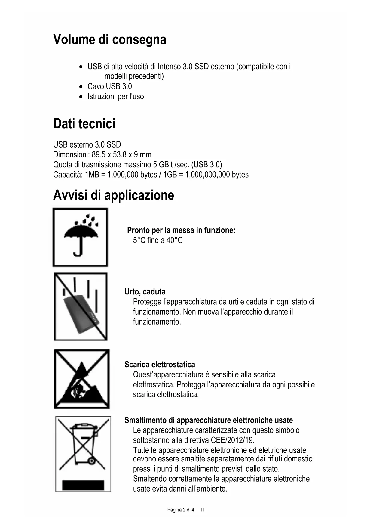 Smaltimento di apparecchiature elettroniche usate Le apparecchiature caratterizzate con questo simbolo sottostanno alla direttiva CEE/2012/19. Tutte le apparecchiature elettroniche ed elettriche usate devono essere smaltite separatamente dai rifiuti domestici pressi i punti di smaltimento previsti dallo stato. Smaltendo correttamente le apparecchiature elettroniche usate evita danni all’ambiente.Pagina 3 di 4 IT Istruzioni d‘installazione Requisiti di sistema: Questo SSD esterno è compatibile con i sistemi operativi MS Windows 7 / 8 / 8.1 / 10 e Mac OS 10.x. Avviso: Per il funzionamento dell‘USB 3.0 si necessita una scheda d’interfaccia USB 3.0. L’SSD esterno è compatibile con gli standard USB precedenti. La configurazione hardware del Suo PC e il sistema operativo impiegato possono influenzare la compatibilità dell’SSD esterno. Collegare l’SSD esterno:
