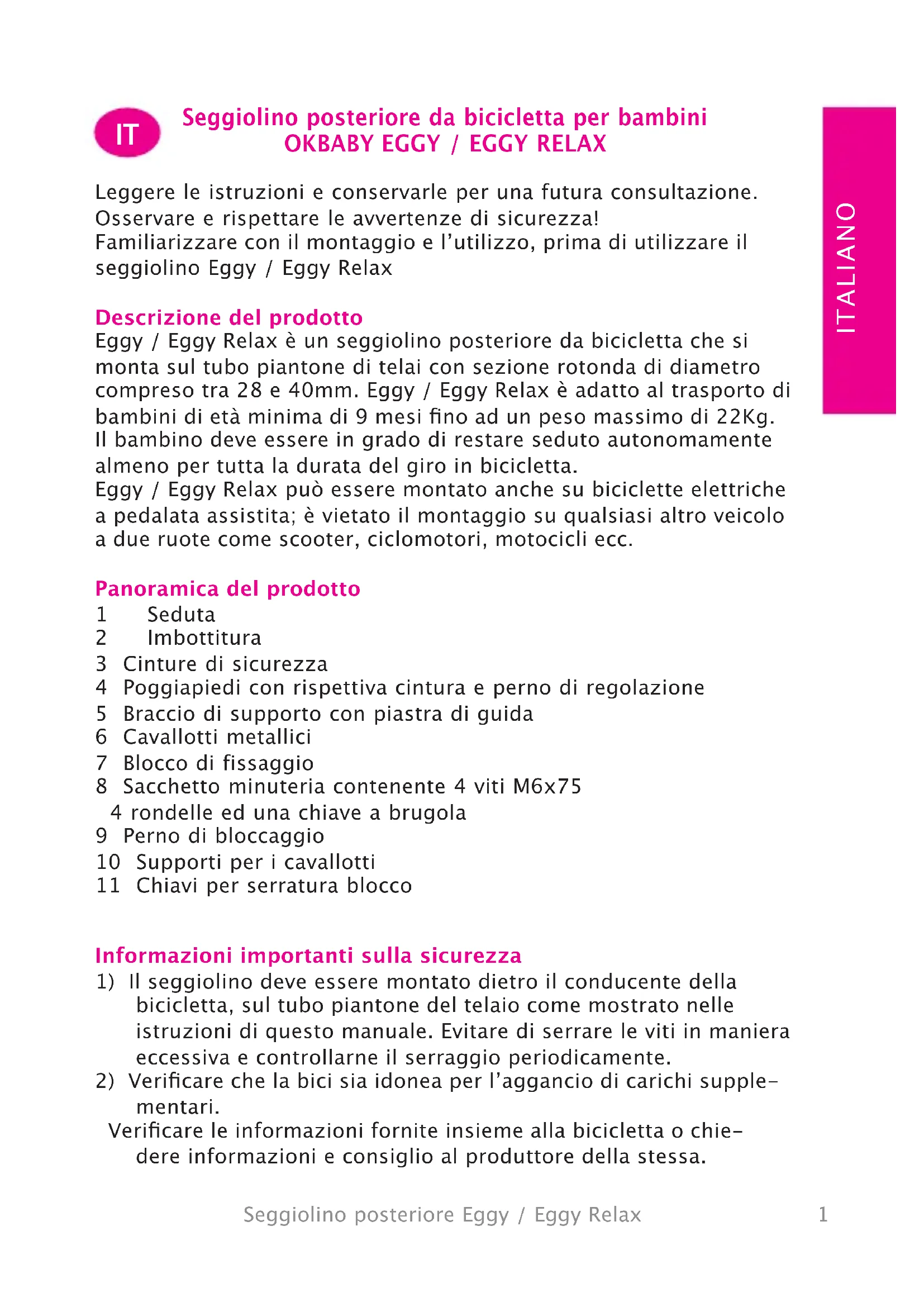 Eggy / Eggy Relax è un seggiolino posteriore da bicyclicetta che si monta sul tubo piantone di telai con sezione rotonda di diametro compreso tra 28 e 40mm. Eggy / Eggy Relax è adatto al trasporto di bambini di età minima di 9 mesi fino ad un peso massimo di 22Kg . Il bambino deve essere in grado di restare seduto autonomamente almeno per tutte la durata del giro in bicyclicta.