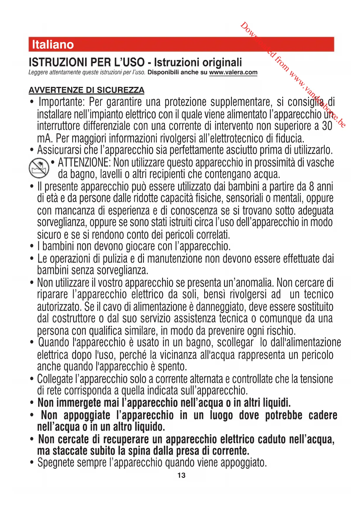 Downloaded from www.vandenborre.be15 della mano, in modo che l’aria calda che fuoriesce da esse possa gonfiare i capelli dalla base, dando loro maggior volume. ATTENZIONE: con il diffusore l’apparecchio deve essere usato soltanto a temperatura/velocità minima. Filtro (per i modelli dotati di questo accessorio) L’asciugacapelli è dotato di un filtro estraibile che trattiene polvere, peluzzi ed altre impurità dell’aria. Il filtro può essere lavato sotto l’acqua corrente. Per estrarlo dall’asciugacapelli, basta staccare dal medesimo la griglia posteriore d’entrata d’aria. Dopo aver lavato il filtro, accertarsi che questo sia perfettamente asciutto prima di rimetterlo nell’asciugacapelli. Quindi rimettere la griglia posteriore. Cambia tensione (per i modelli dotati di questo dispositivo) Se l’asciugacapelli è dotato di questo dispositivo, dovete selezionare precedentemente all’uso la tensione 110-125 V oppure 220-240 V, corrispondentemente alla tensione di rete. Azionare il cambiatensione mediante un piccolo cacciavite o altro oggetto simile. lonic Wellness (per gli asciugacapelli dotati di questo dispositivo) Questa funzione è associata ad un generatore che produce milioni di ioni negativi purificanti. Cosa sono gli ioni? Gli ioni sono particelle cariche elettricamente presenti in natura. Gli ioni carichi negativamente aiutano a purificare l’aria neutralizzando gli ioni carichi positivamente che, al contrario, contribuiscono al suo deterioramento trattenendo nell’atmosfera gran parte degli agenti inquinanti. Si rileva una grande abbondanza di ioni con carica negativa dopo un temporale oppure al mare o in montagna in prossimità di cascate e corsi d’acqua dove si percepiscono sensazioni di benessere perché si è in presenza di aria più pura, naturale, rivitalizzante. Migliore idratazione dei capelli Gli ioni con carica negativa aiutano a preservare la giusta idratazione dei capelli. Essi infatti micronizzano le particelle d’acqua, presenti sui capelli appena lavati, permettendone l’assorbimento di una maggiore quantità all’interno dello stelo, in modo da restaurare l’equilibrio di umidità naturale del capello. Effetto balsamo sui capelli La migliore idratazione favorisce il condizionamento dei vostri capelli, ha un effetto rigenerante e li rende più morbidi e facili da pettinare, con più volume e lucentezza. No carica elettrostatica o “fly away” Gli ioni con carica negativa aiutano a ridurre l’elettricità statica e l’effetto “fly away” dei capelli (capelli rizzi) e le increspature. Effetto purificante Gli ioni con carica negativa emessi dall’asciugacapelli fanno si che le particelle inquinanti dell’aria (cariche positivamente o neutre) si attraggano l’un l’altra, diventino pesanti e precipitino al suolo per gravità, purificando così l’aria. Garanzia VALERA garantisce l’apparecchio da Voi acquistato alle seguenti condizioni: