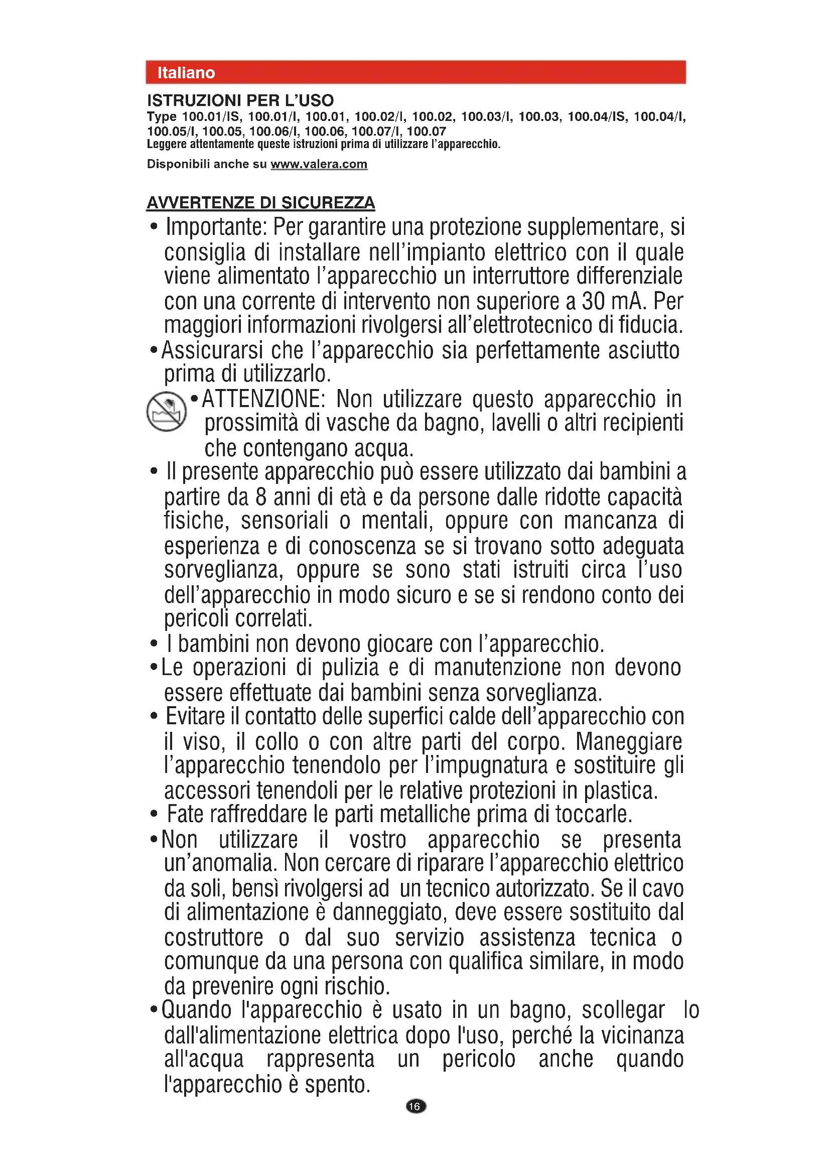 Type 100.01/IS, 100.01/I, 100.01, 100.02/I, 100.02, 100.03/I, 100.03, 100.04/IS, 100.04/I, 100.05/I, 100.05, 100.06/I, 100.06, 100.07/I, 100.07 Leggere attentamente queste istruzioni prima di utilizzare l’apparecchio. Disponibili anche su www.valera.com