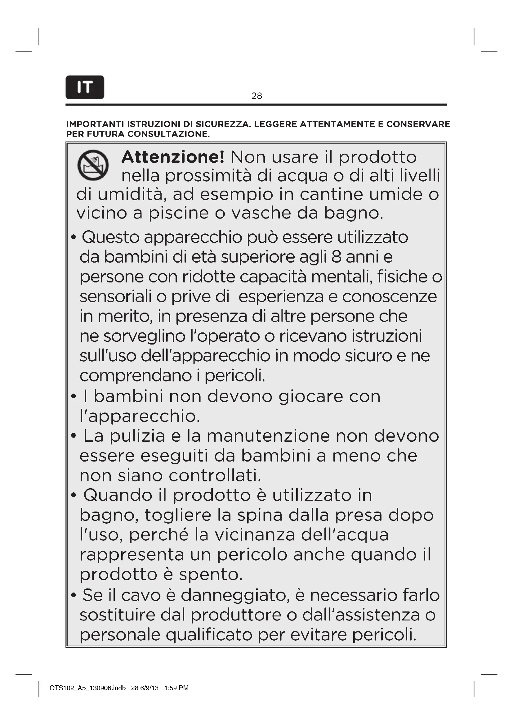 - Se il cavo è danneggiato, è necessario farlo sostituire dal produttore o dall’assistenza o personale qualificato per evitare pericoli. OTS102_A5_130906.indb 28 6/9/13 1:59 PM29