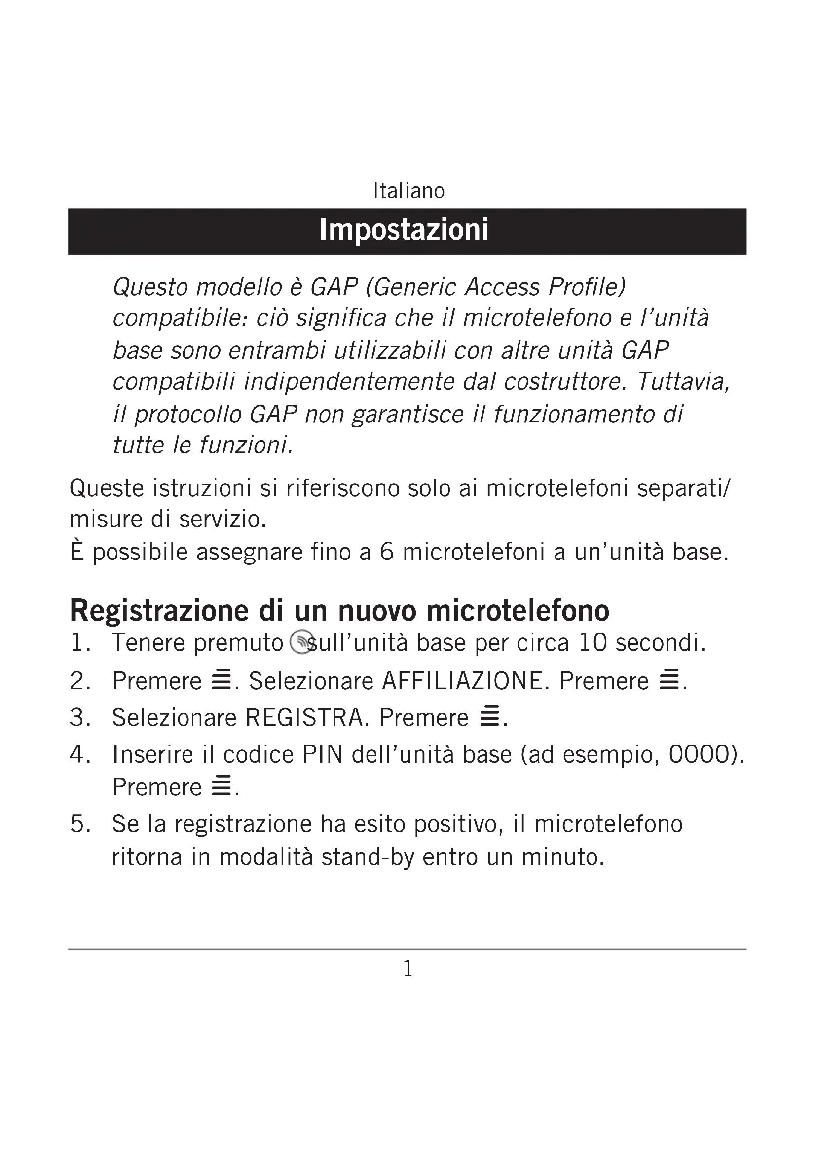 Se la registrazione ha esito positivo, il microtelefono ritorna in modalità stand-by entro un minuto.