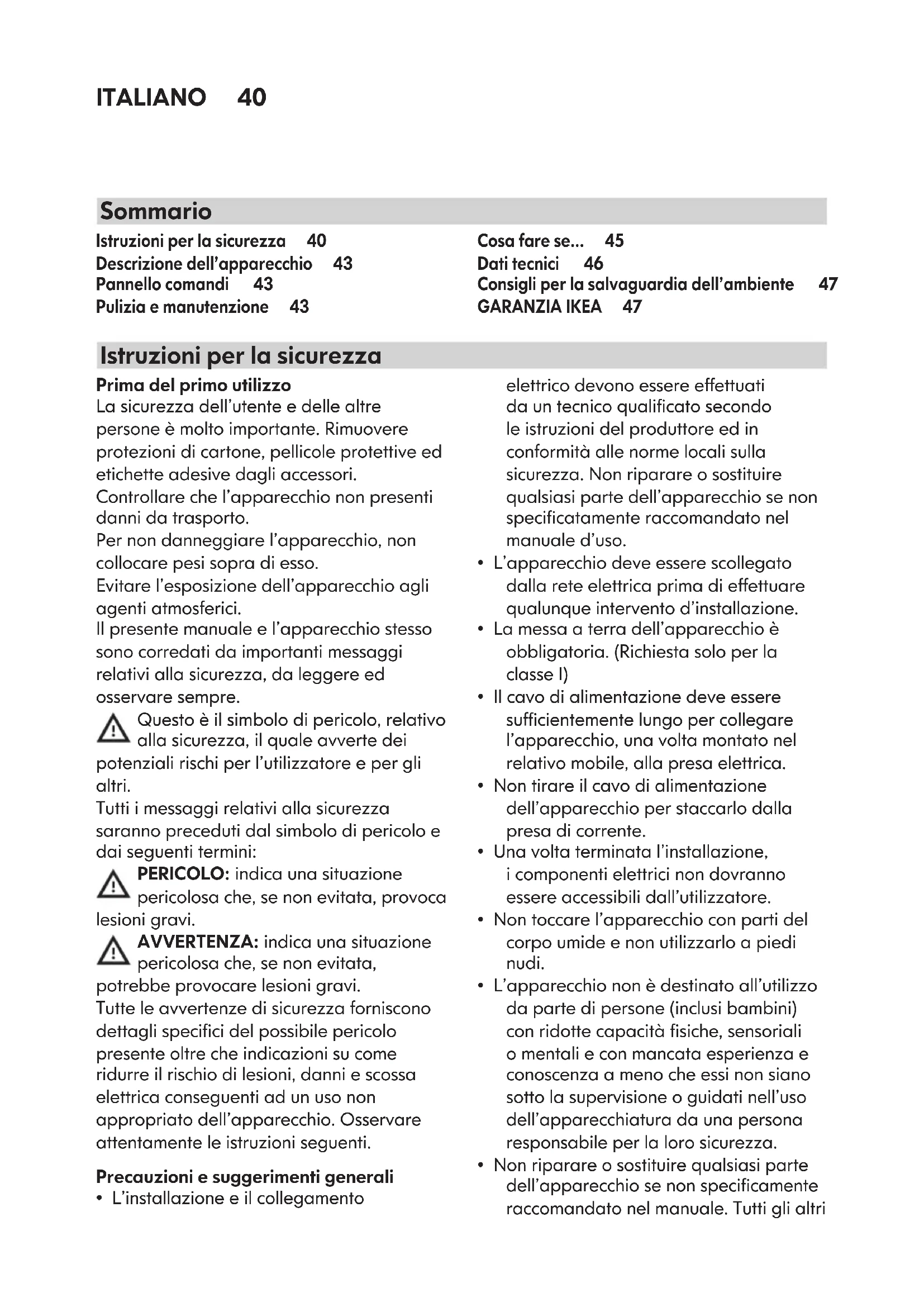 - Non riparare o sostituire qualsiasi parte dell’apparecchio se non specicamente raccomandato nel manuale. Tutti gli altri Istruzioniperlasicurezza 40 Descrizionedell’apparecchio 43 Pannellocomandi 43 Puliziaemanutenzione 43 Cosafarese... 45 Datitecnici 46 Consigliperlasalvaguardiadell’ambiente 47 GARANZIAIKEA 47 Istruzioniperlasicurezza SommarioITALIANO 41 servizi di manutenzione devono essere eseguiti da un tecnico specializzato.