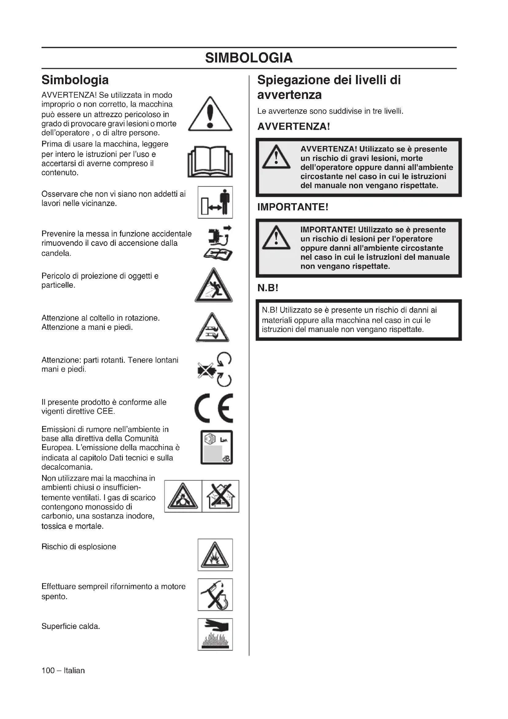 - van 8 mei 2000 ”betreffende geluidsemissie door materieel voor gebruik buitenshuis” 2000/14/EG. Voor informatie betreffende lawaaiemissies, zie hoofdstuk Technische gegevens. De volgende normen zijn van toepassing: EN 836, ISO 11094, EN 55012. Aangemelde instantie: 0404, SMP Svensk Maskinprovning AB, Fyrisborgsgatan 3, SE-754 50 Uppsala, heeft rapporten opgesteld inzake een beoordeling van de overeenstemming met bijlage VI van Richtlijn 2000/14/EG van de Raad van 8 mei 2000 betreffende "de geluidsemissie door materieel voor gebruik buitenshuis". Huskvarna, 14 december 2012 Bengt Ahlund, Hoofd Ontwikkeling (erkende vertegenwoordiger voor Husqvarna AB en verantwoordelijk voor technische documentatie.)SIMBOLOGIA 100 – Italian Simbologia AVVERTENZA! Se utilizzata in modo improprio o non corretto, la macchina può essere un attrezzo pericoloso in grado di provocare gravi lesioni o morte dell’operatore , o di altre persone. Prima di usare la macchina, leggere per intero le istruzioni per l’uso e accertarsi di averne compreso il contenuto. Osservare che non vi siano non addetti ai lavori nelle vicinanze. Prevenire la messa in funzione accidentale rimuovendo il cavo di accensione dalla candela. Pericolo di proiezione di oggetti e particelle. Attenzione al coltello in rotazione. Attenzione a mani e piedi. Attenzione: parti rotanti. Tenere lontani mani e piedi. Il presente prodotto è conforme alle vigenti direttive CEE. Emissioni di rumore nell’ambiente in base alla direttiva della Comunità Europea. L’emissione della macchina è indicata al capitolo Dati tecnici e sulla decalcomania. Non utilizzare mai la macchina in ambienti chiusi o insufficien- temente ventilati. I gas di scarico contengono monossido di carbonio, una sostanza inodore, tossica e mortale. Rischio di esplosione Effettuare sempreil rifornimento a motore spento. Superficie calda. Spiegazione dei livelli di avvertenza Le avvertenze sono suddivise in tre livelli. AVVERTENZA! IMPORTANTE! N.B!