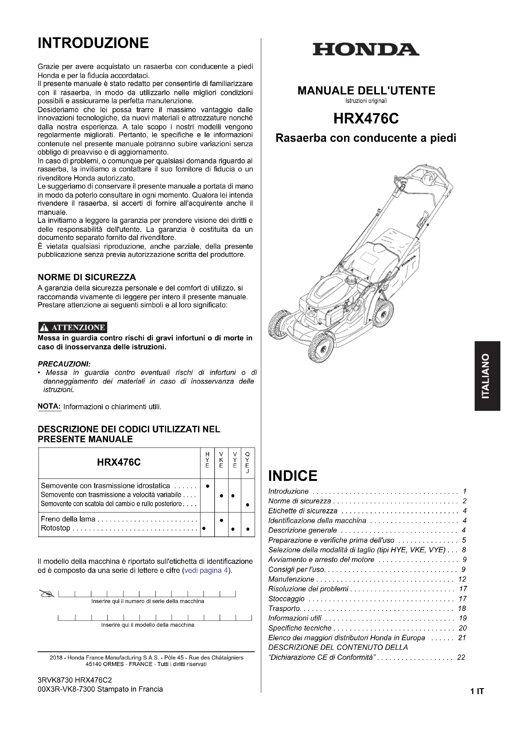 HRX476C - Tosaerba Honda - Manuale utente e istruzioni gratuiti