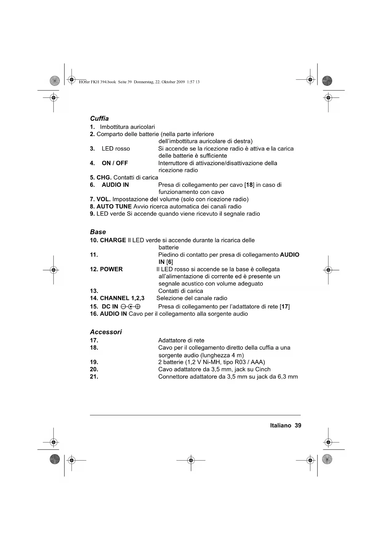 audio. In base alla presa di collegamento nella sorgente audio è possibile utilizzare uno degli adattatori [20] e [21]. HOfer FKH 394.book Seite 47 Donnerstag, 22. Oktober 2009 1:57 1348 Italiano