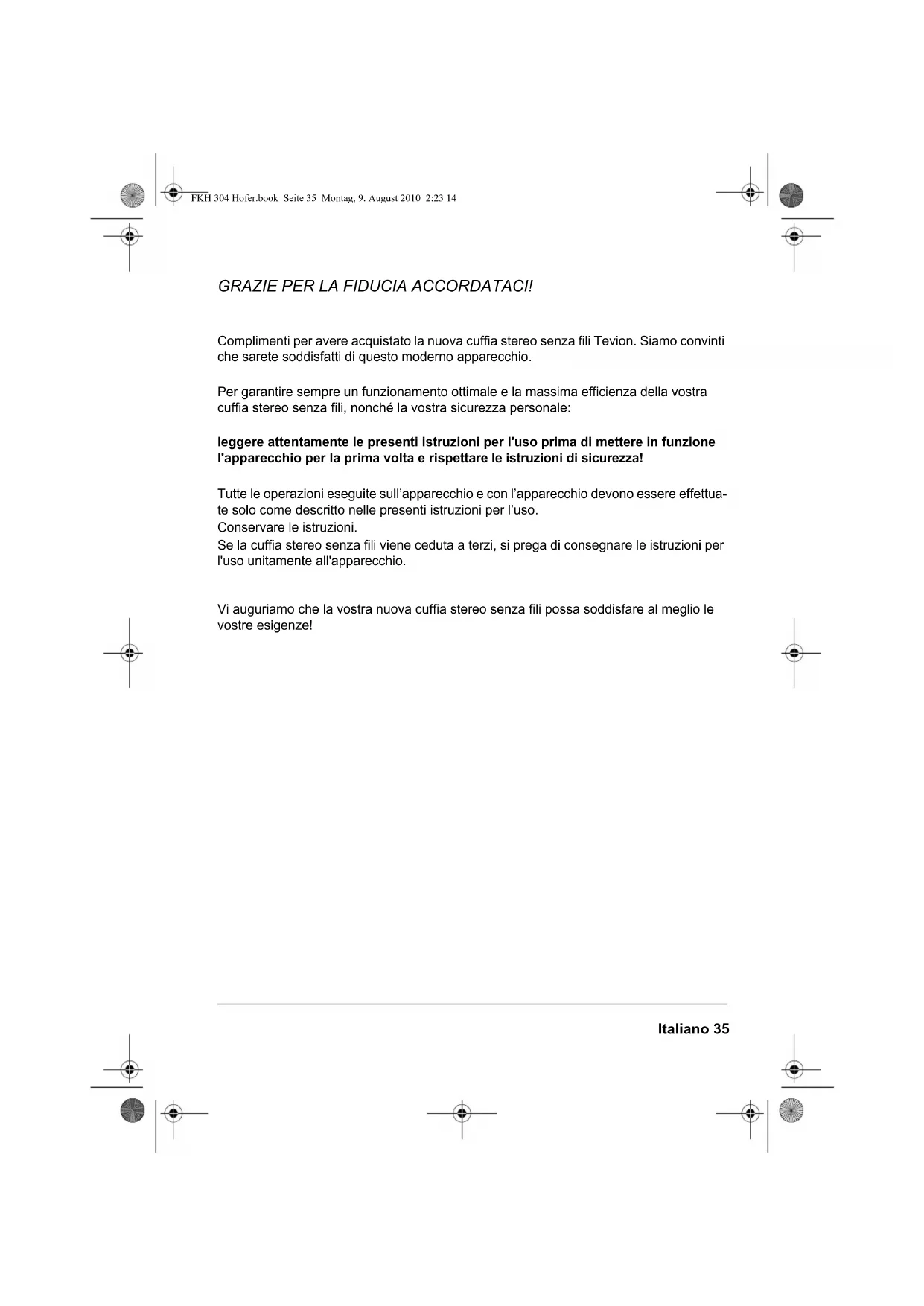 FKH 304 Hofer.book Seite 34 Montag, 9. August 2010 2:23 14Italiano 35 GRAZIE PER LA FIDUCIA ACCORDATACI! Complimenti per avere acquistato la nuova cuffia stereo senza fili Tevion. Siamo convinti che sarete soddisfatti di questo moderno apparecchio. Per garantire sempre un funzionamento ottimale e la massima efficienza della vostra cuffia stereo senza fili, nonché la vostra sicurezza personale: leggere attentamente le presenti istruzioni per l'uso prima di mettere in funzione l'apparecchio per la prima volta e rispettare le istruzioni di sicurezza! Tutte le operazioni eseguite sull’apparecchio e con l’apparecchio devono essere effettua- te solo come descritto nelle presenti istruzioni per l’uso. Conservare le istruzioni. Se la cuffia stereo senza fili viene ceduta a terzi, si prega di consegnare le istruzioni per l'uso unitamente all'apparecchio. Vi auguriamo che la vostra nuova cuffia stereo senza fili possa soddisfare al meglio le vostre esigenze! FKH 304 Hofer.book Seite 35 Montag, 9. August 2010 2:23 1436 Italiano
