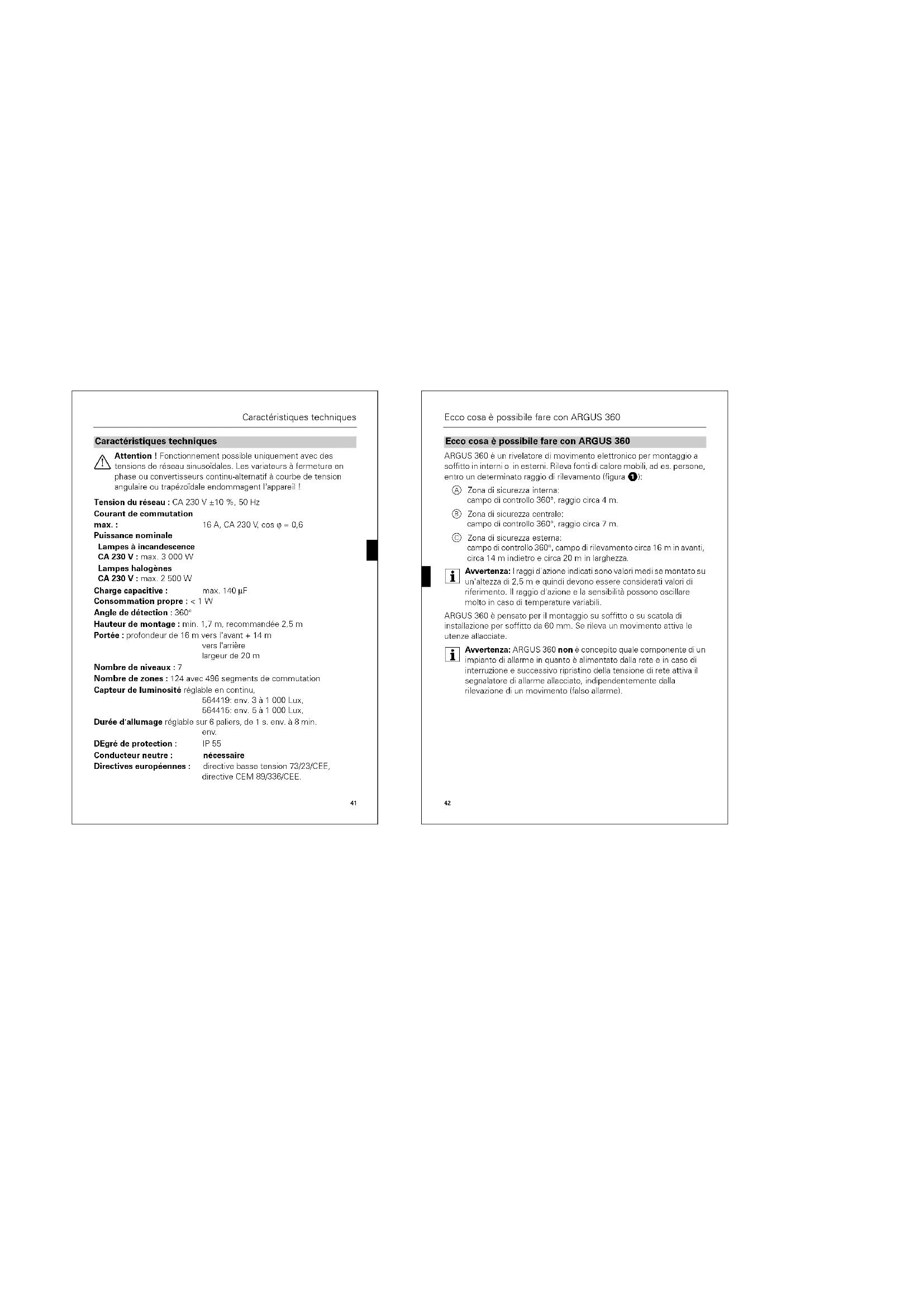 i Avvertenza: ARGUS 360 non è concepito quale componente di un impianto di allarme in quanto è alimentato dalla rete e in caso di interruzione e successivo ripristino della tensione di rete attiva il segnalatore di allarme allacciato, indipendentemente dalla rilevazione di un movimento (falso allarme).