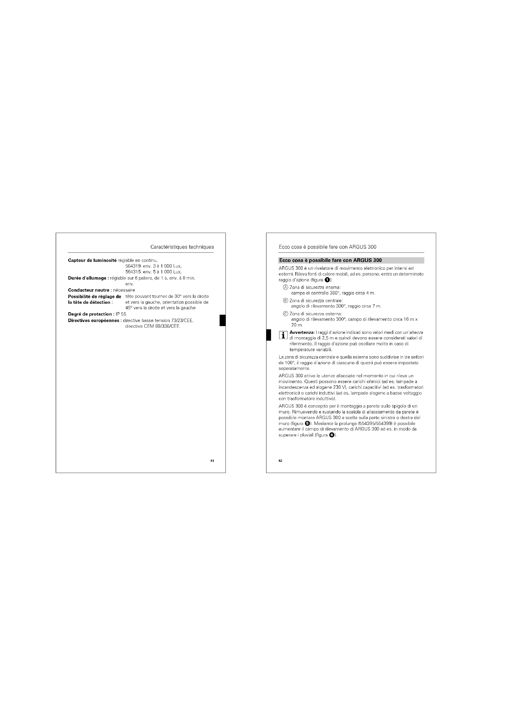 Avvertenza: ARGUS 300 non è concezione quale componente di un impianto di allarme in quanto è alimentato alla rete e in caso di interrup tion e successivo ripristino della tensione di rote attiva il segnatiore di allarme allaccato, indipendentemente da l'revazione di un movimento (falso allarme).