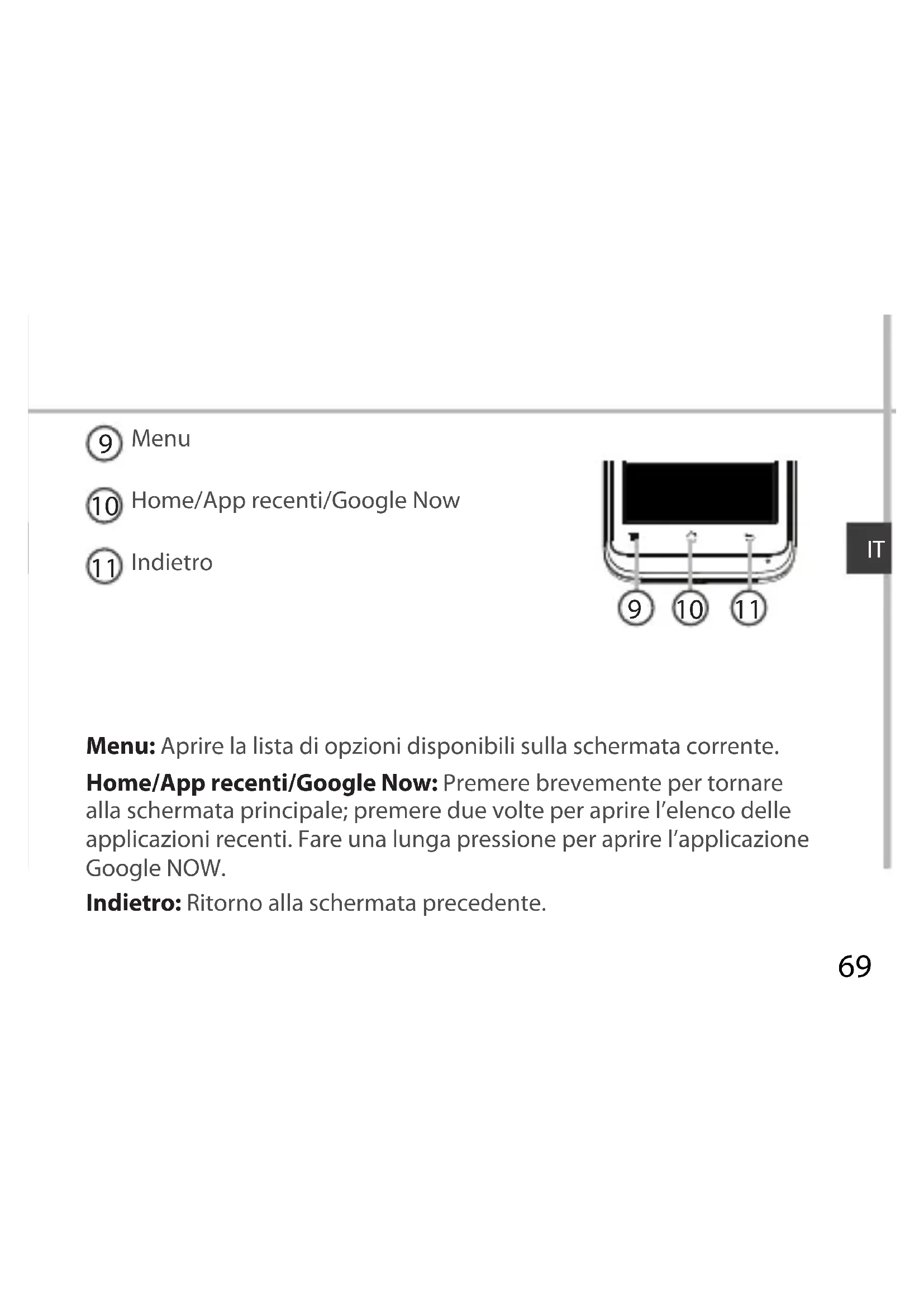 Menu: Aprire la lista di opzioni disponibili sulla schermata corrente. Home/App recenti/Google Now: Premere brevemente per tornare alla schermata principale; premere due volte per aprire l’elenco delle applicazioni recenti. Fare una lunga pressione per aprire l’applicazione Google NOW. Indietro: Ritorno alla schermata precedente.70 Assemblaggio Apertura