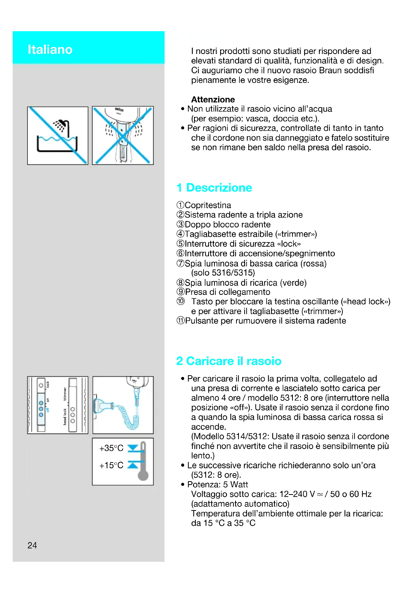 - Potenza: 5 Watt Voltaggio sotto carica: 12–240 V2/ 50 o 60 Hz (adattamento automatico) Temperatura dell’ambiente ottimale per la ricarica: da 15 °C a 35 °C +35°C +15°C off on lock trimmerhead lock Italiano 5465151_FI5312_16_MN Seite 24 Mittwoch, 4. Dezember 2002 2:29 1425 3 Spie luminose