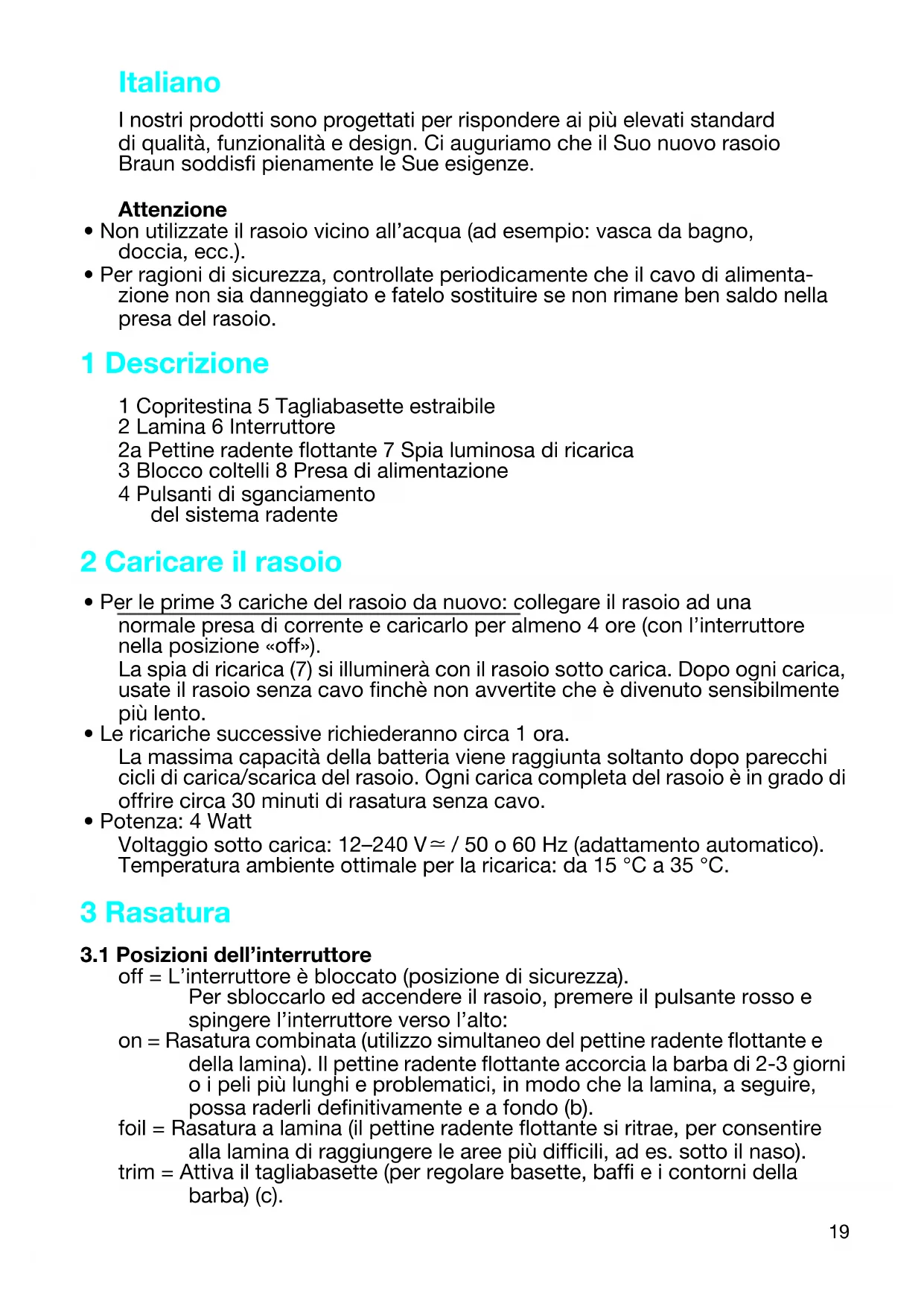 ). (Se il rasoio non dovesse funzionare subito, caricarlo, con l’interruttore nella posizione «off», per circa 1 minuto.) 4 Come tenere il Vostro rasoio in condizioni perfette