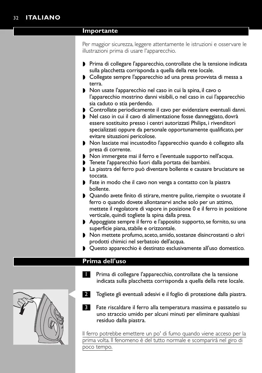 ITALIANO Importante Per maggior sicurezza, leggere attentamente le istruzioni e osservare le illustrazioni prima di usare l'apparecchio. ◗ Prima di collegare l'apparecchio, controllate che la tensione indicata sulla placchetta corrisponda a quella della rete locale. ◗ Collegate sempre l'apparecchio ad una presa provvista di messa a terra. ◗ Non usate l'apparecchio nel caso in cui la spina, il cavo o l'apparecchio mostrino danni visibili, o nel caso in cui l'apparecchio sia caduto o stia perdendo. ◗ Controllate periodicamente il cavo per evidenziare eventuali danni. ◗ Nel caso in cui il cavo di alimentazione fosse danneggiato, dovrà essere sostituito presso i centri autorizzati Philips, i rivenditori specializzati oppure da personale opportunamente qualificato, per evitare situazioni pericolose. ◗ Non lasciate mai incustodito l'apparecchio quando è collegato alla presa di corrente. ◗ Non immergete mai il ferro e l'eventuale supporto nell'acqua. ◗ Tenete l'apparecchio fuori dalla portata dei bambini. ◗ La piastra del ferro può diventare bollente e causare bruciature se toccata. ◗ Fate in modo che il cavo non venga a contatto con la piastra bollente. ◗ Quando avete finito di stirare, mentre pulite, riempite o svuotate il ferro o quando dovete allontanarvi anche solo per un attimo, mettete il regolatore di vapore in posizione 0 e il ferro in posizione verticale, quindi togliete la spina dalla presa. ◗ Appoggiate sempre il ferro e l'apposito supporto, se fornito, su una superficie piana, stabile e orizzontale. ◗ Non mettete profumo, aceto, amido, sostanze disincrostanti o altri prodotti chimici nel serbatoio dell'acqua. ◗ Questo apparecchio è destinato esclusivamente all'uso domestico. Prima dell'uso
