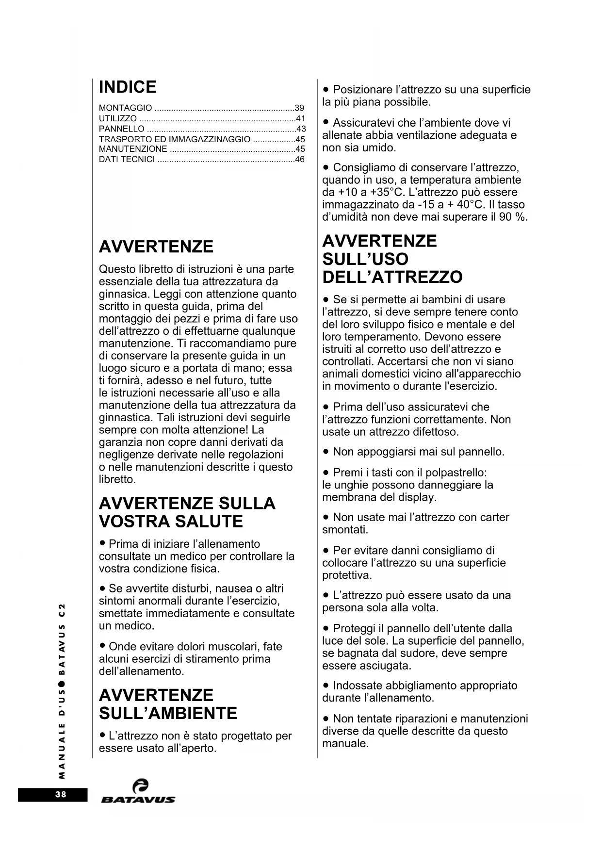 Questo libretto di istruzioni è una parte essenziale della tua attrezzatura da ginnasica. Leggi con attenzione quanto scritto in questa guida, prima del montaggio dei pezzi e prima di fare uso dell'attrezzo o di effettuarne qualunque manutenzione. Ti raccomandiamo pure di conservare la presente guida in un luogo sicuro e a portata di mano; essa ti fornirà, adesso e nel futuro, tutte le istruzioni necessarie all'uso e alla manutenzione della tua attrezzatura da ginnastica. Tali istruzioni devi seguirle sempre con molta attenzione! La garanzia non copre danni derivati da negligenze derivate nelle regolazioni o nelle manutenzioni descritte i questo libretto.