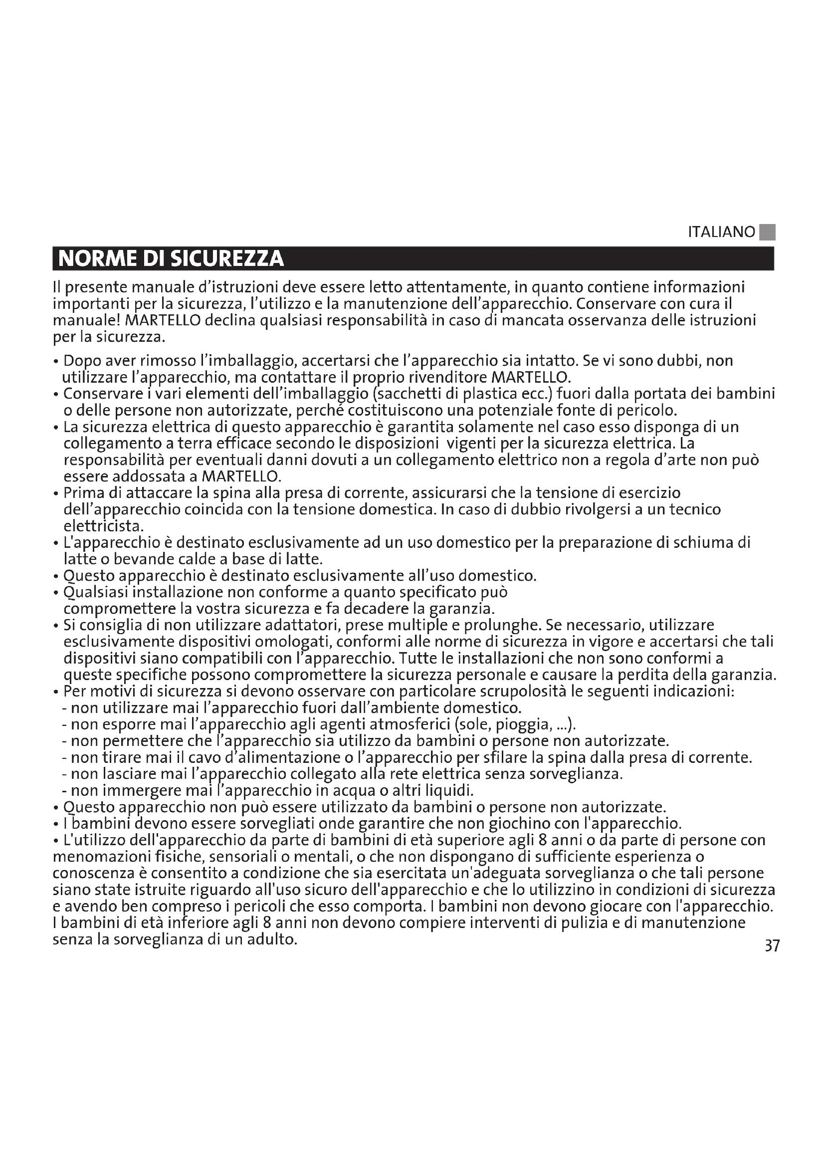 Hofer_IM_Milchschäumer_schwarz_IT_2013-09-27_Layout 1 27.09.13 12:54 Seite 2NORME DI SICUREZZA ITALIANO g Il presente manuale d’istruzioni deve essere letto attentamente, in quanto contiene informazioni importanti per la sicurezza, l’utilizzo e la manutenzione dell’apparecchio. Conservare con cura il manuale! MARTELLO declina qualsiasi responsabilità in caso di mancata osservanza delle istruzioni per la sicurezza.