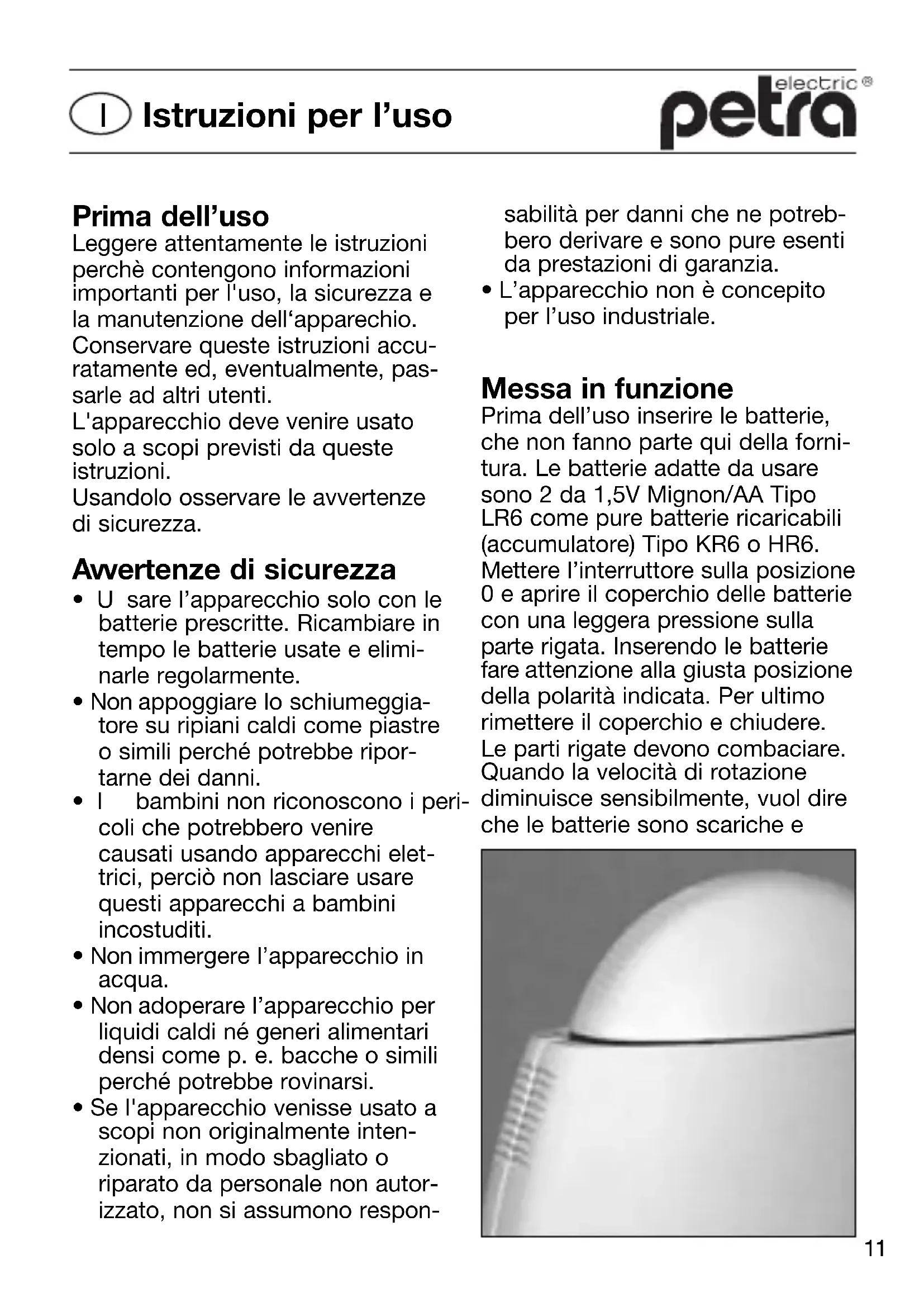 - L’apparecchio non è concepito per l’uso industriale. Messa in funzione Prima dell’uso inserire le batterie, che non fanno parte qui della forni- tura. Le batterie adatte da usare sono 2 da 1,5V Mignon/AA Tipo LR6 come pure batterie ricaricabili (accumulatore) Tipo KR6 o HR6. Mettere l’interruttore sulla posizione 0 e aprire il coperchio delle batterie con una leggera pressione sulla parte rigata. Inserendo le batterie fare attenzione alla giusta posizione della polarità indicata. Per ultimo rimettere il coperchio e chiudere. Le parti rigate devono combaciare. Quando la velocità di rotazione diminuisce sensibilmente, vuol dire che le batterie sono scariche e