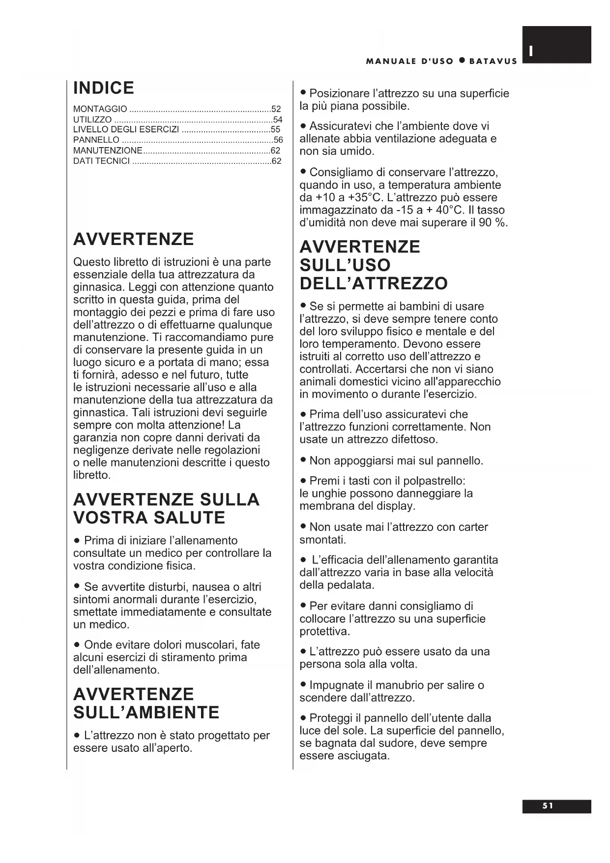 ATTENZIONE! La garanzia non copre danni derivanti da inosservanza, nel montaggio, regolazione e manutenzione, delle istruzioni fornite nella presente guida. Le istruzioni per montaggio, uso e manutenzione della tua attrezzatura, devono essere seguite con molta cura. Non rispondiamo di dati o modifiche non expressamente approbate da Batavus.